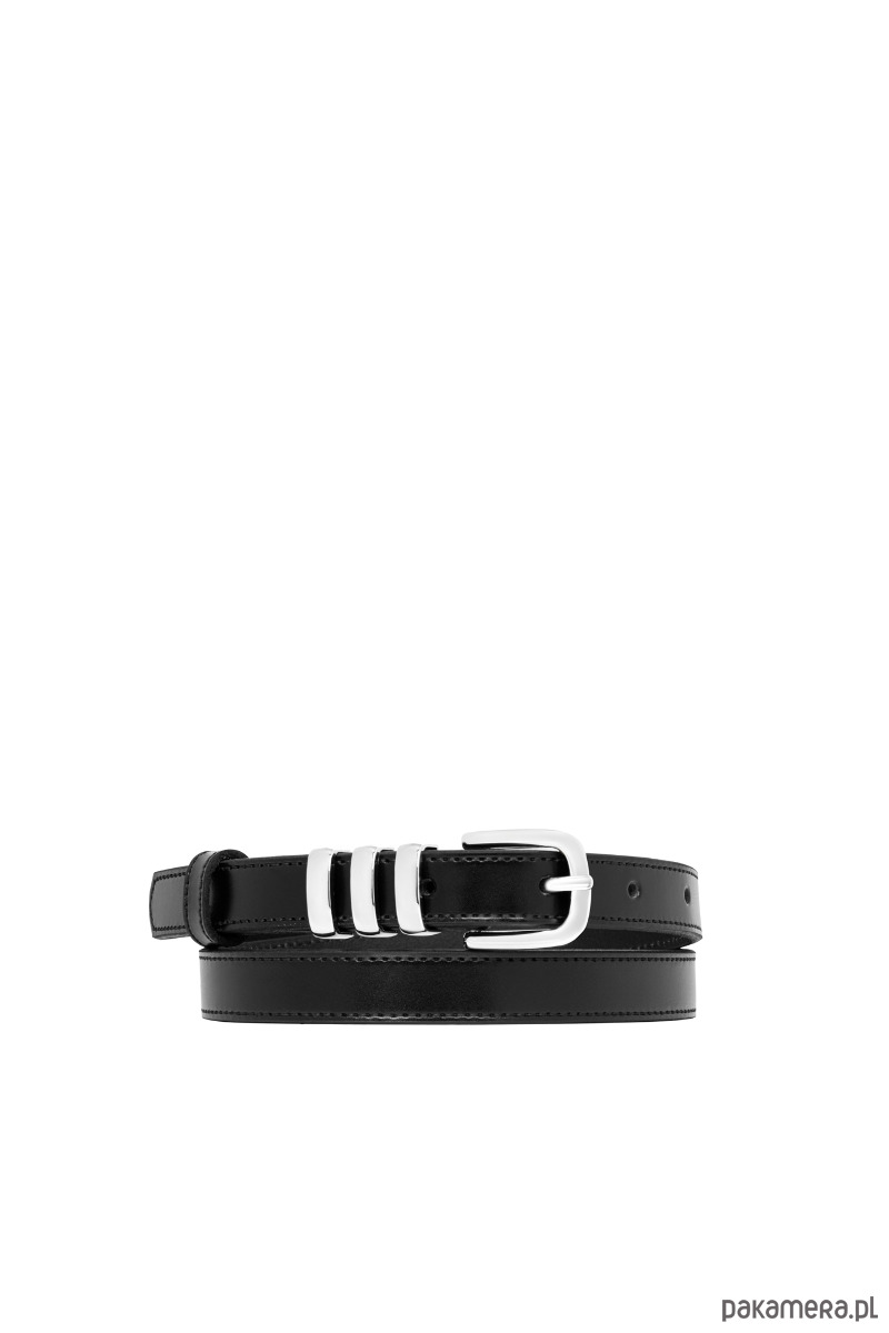 Damski, skórzany pasek wykonany z gładkiej, eleganckiej skóry. Przykuwa uwagę wyjątkowymi okuciami w kolorze srebrnym.