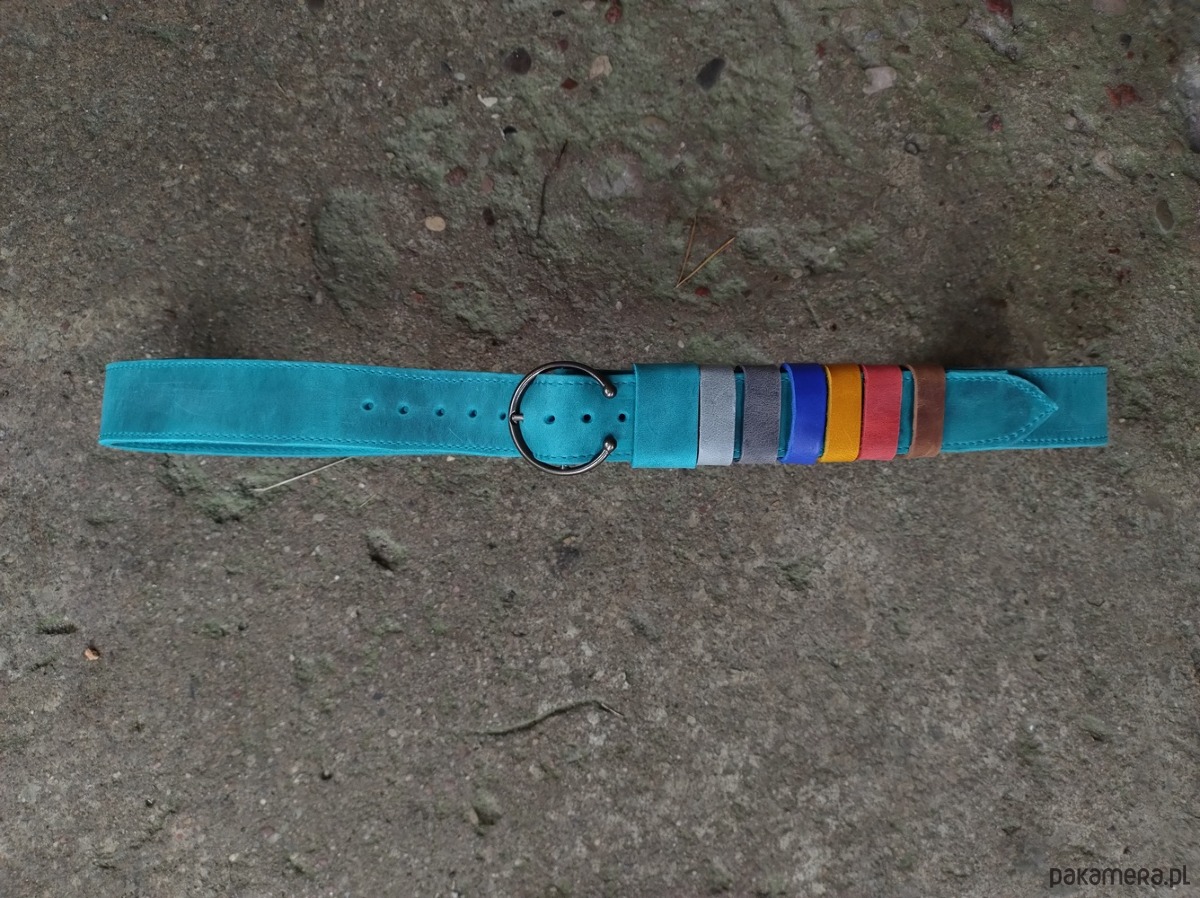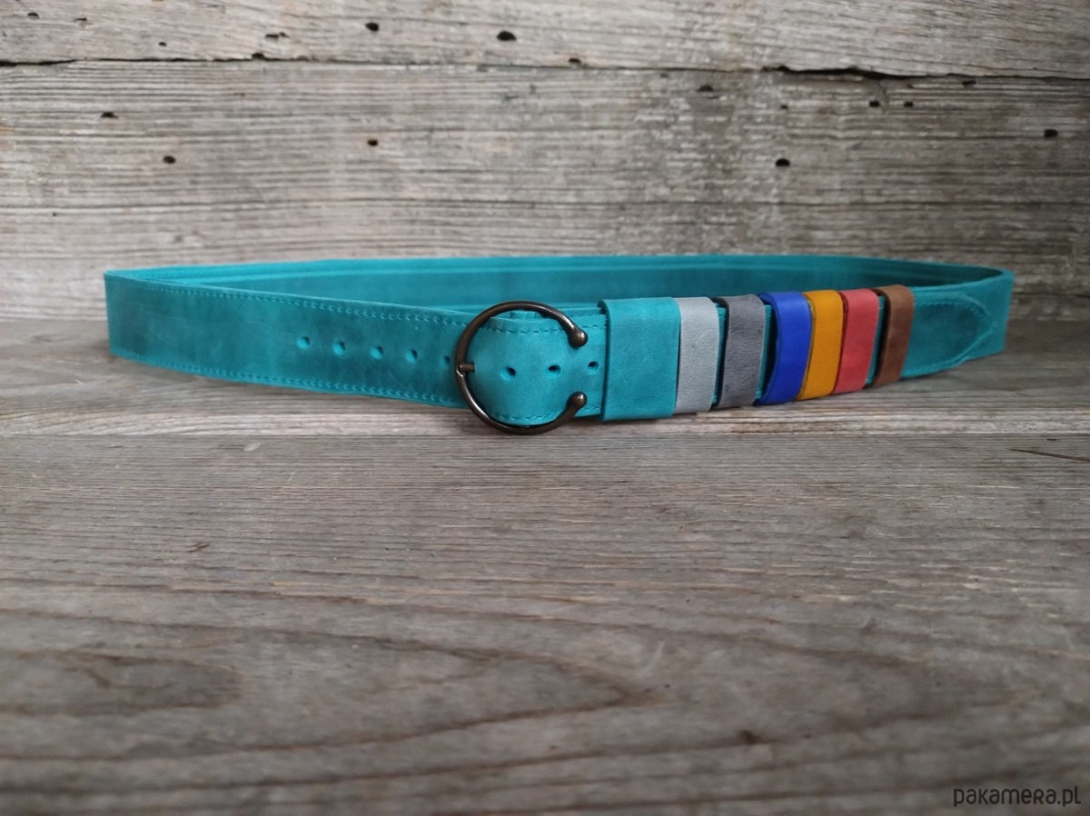 Pasek wykonany ręcznie z naturalnej, impregnowanej skóry w kolorze turkusowym. Ozdobiony kolorowymi szkufkami które można ściągnąć. Długość paska regulowana -120 cm