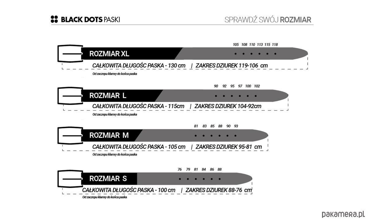 - Pasek posiada 7 dziurek rozstawionych co 2,5 cm, co umożliwia regulację obwodu do 15 cm.