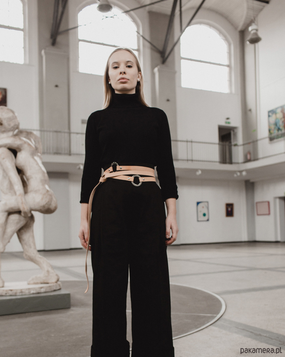 Skórzany pasek łączony za pośrednictwem eleganckiego okucia. Można go nosić zawiązanego kilkukrotnie w pasie lub jako szelki. Składa się z 5 kółek.