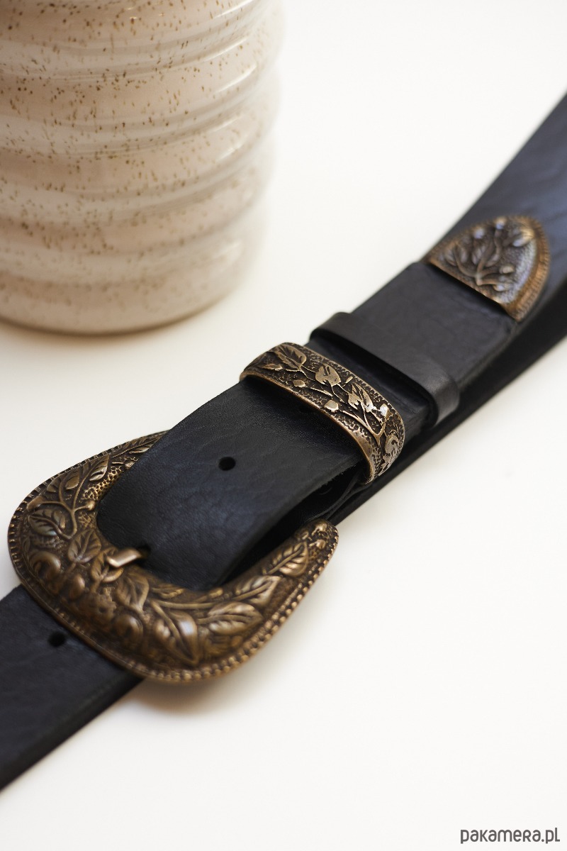 – pasek posiada pełen komplet okuć: klamrę, szlufkę oraz końcówkę z motywem kwiatów/liści