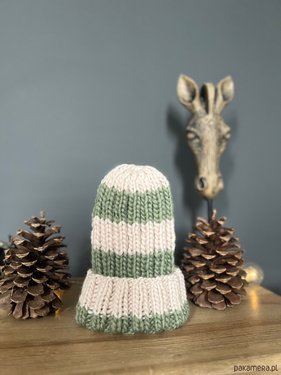 Czapka w kolorze kremowym i zielonym, wykonana z naturalnej włóczki 100% wełna.