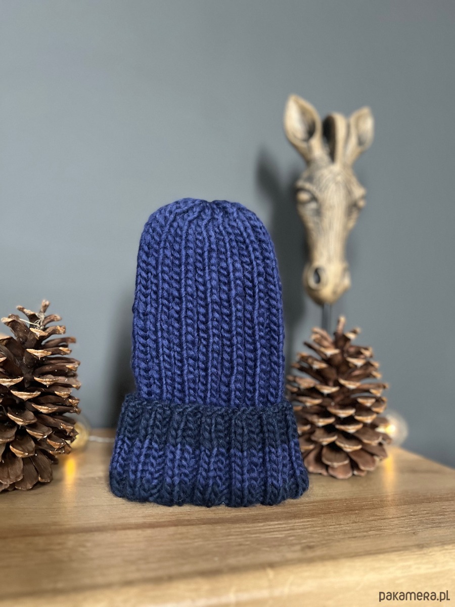 Czapka w kolorze niebieskim i granatowym, wykonana z naturalnej włóczki 100% wełna.
