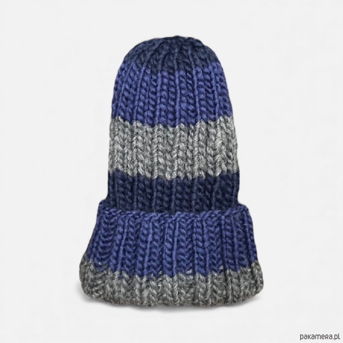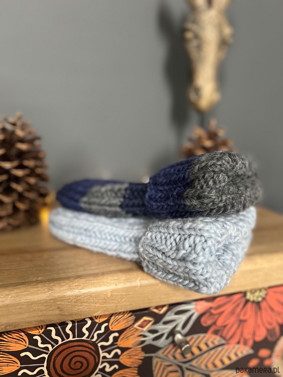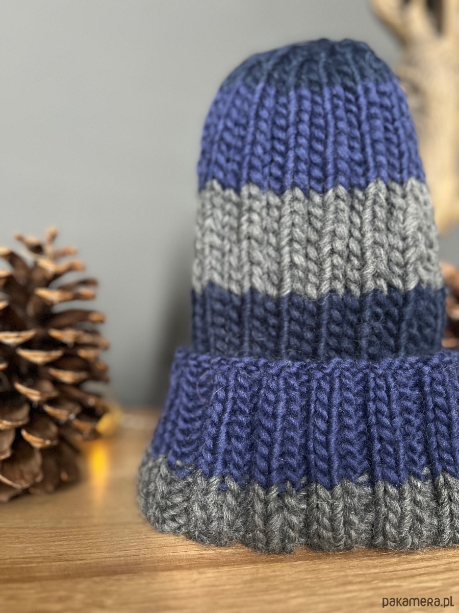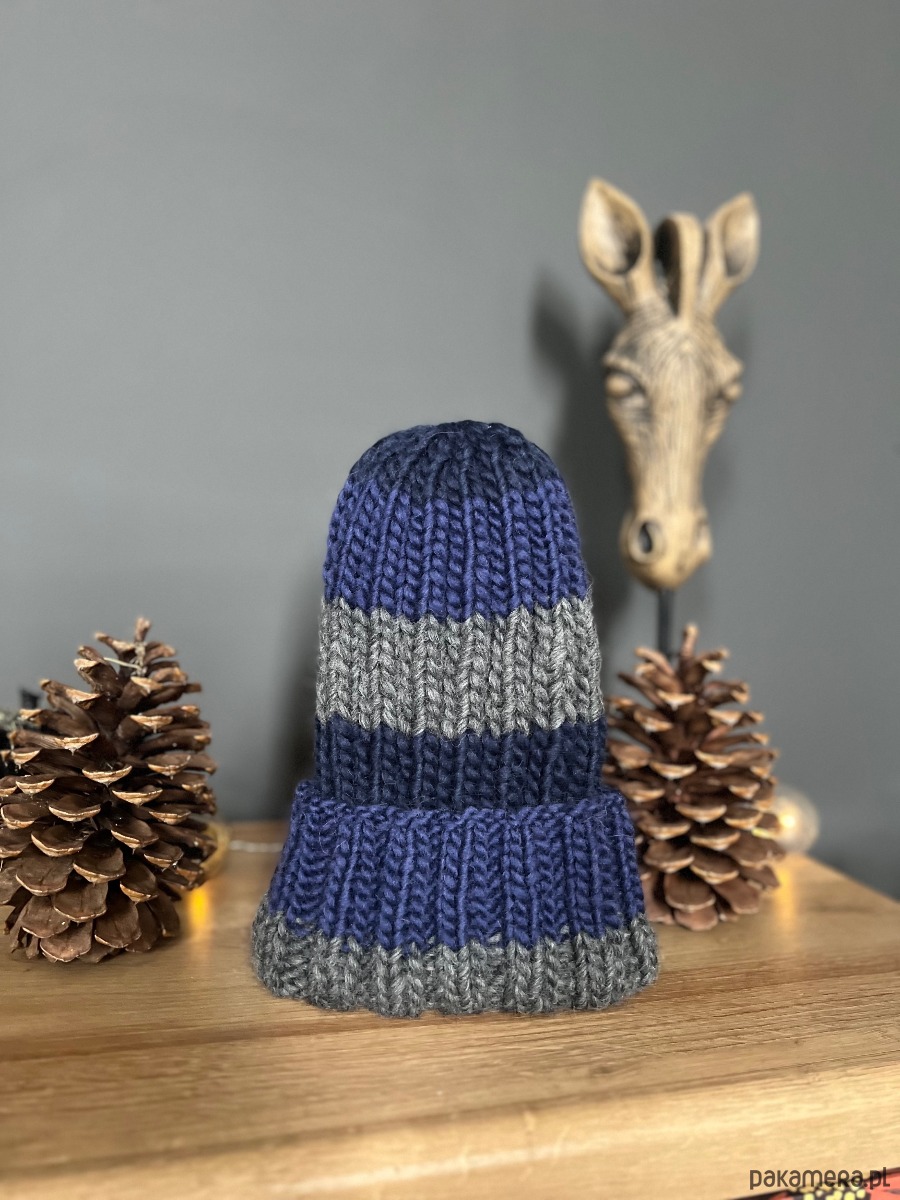 Czapka w kolorze niebieskim granatowym i szarym, wykonana z naturalnej włóczki 100% wełna.