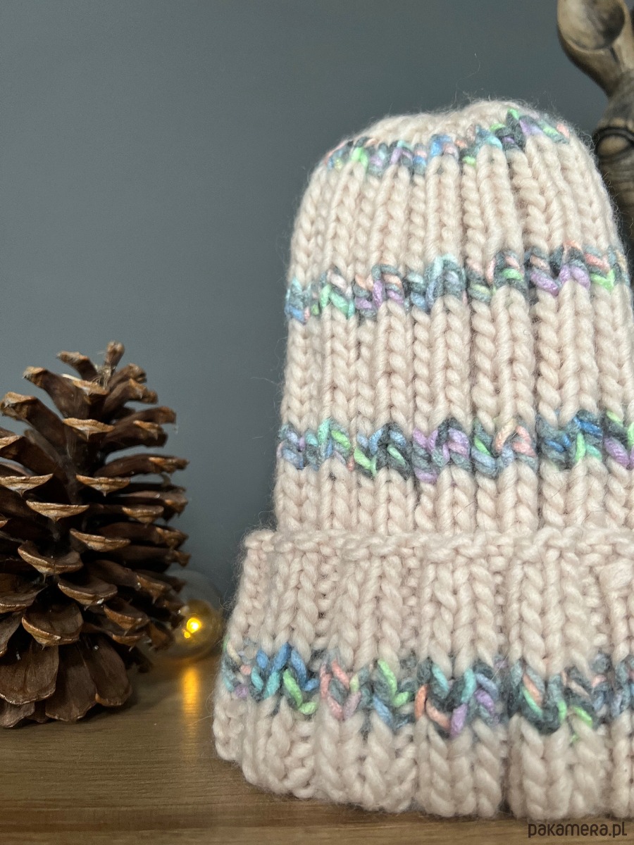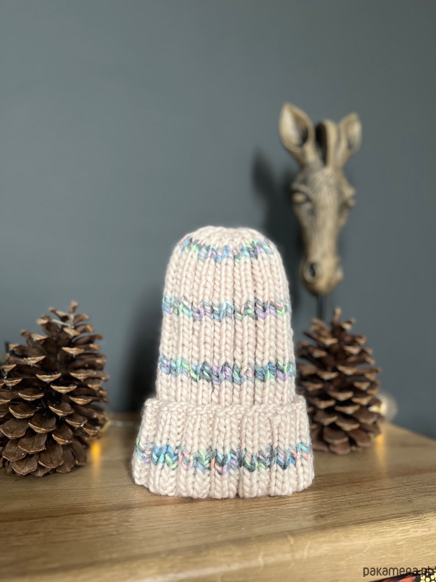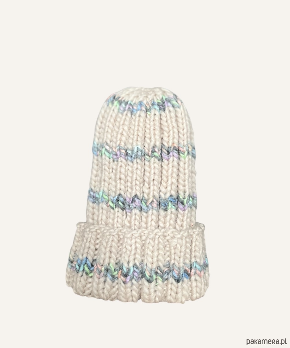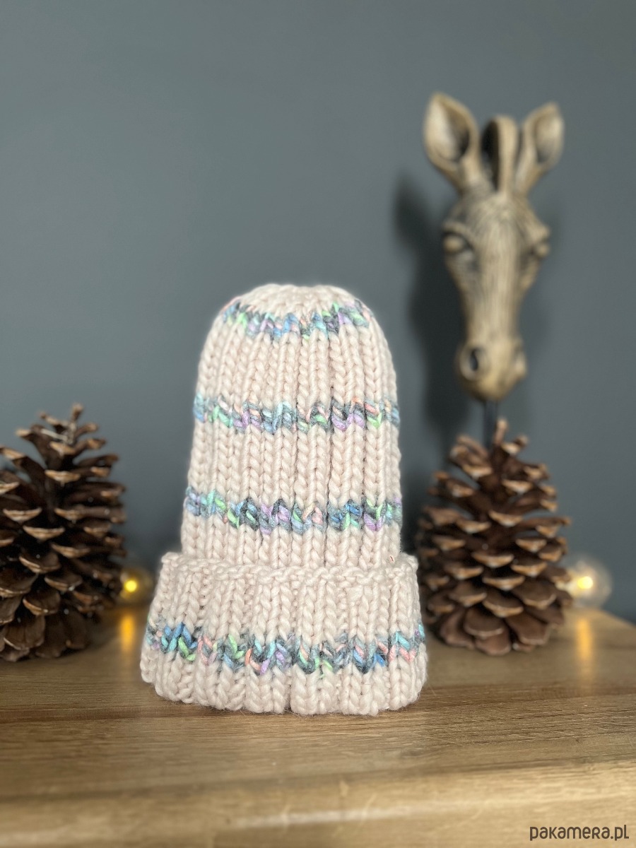 Czapka w paski, wykonana z naturalnej włóczki 100% wełna ozdobne paski 100% akryl.