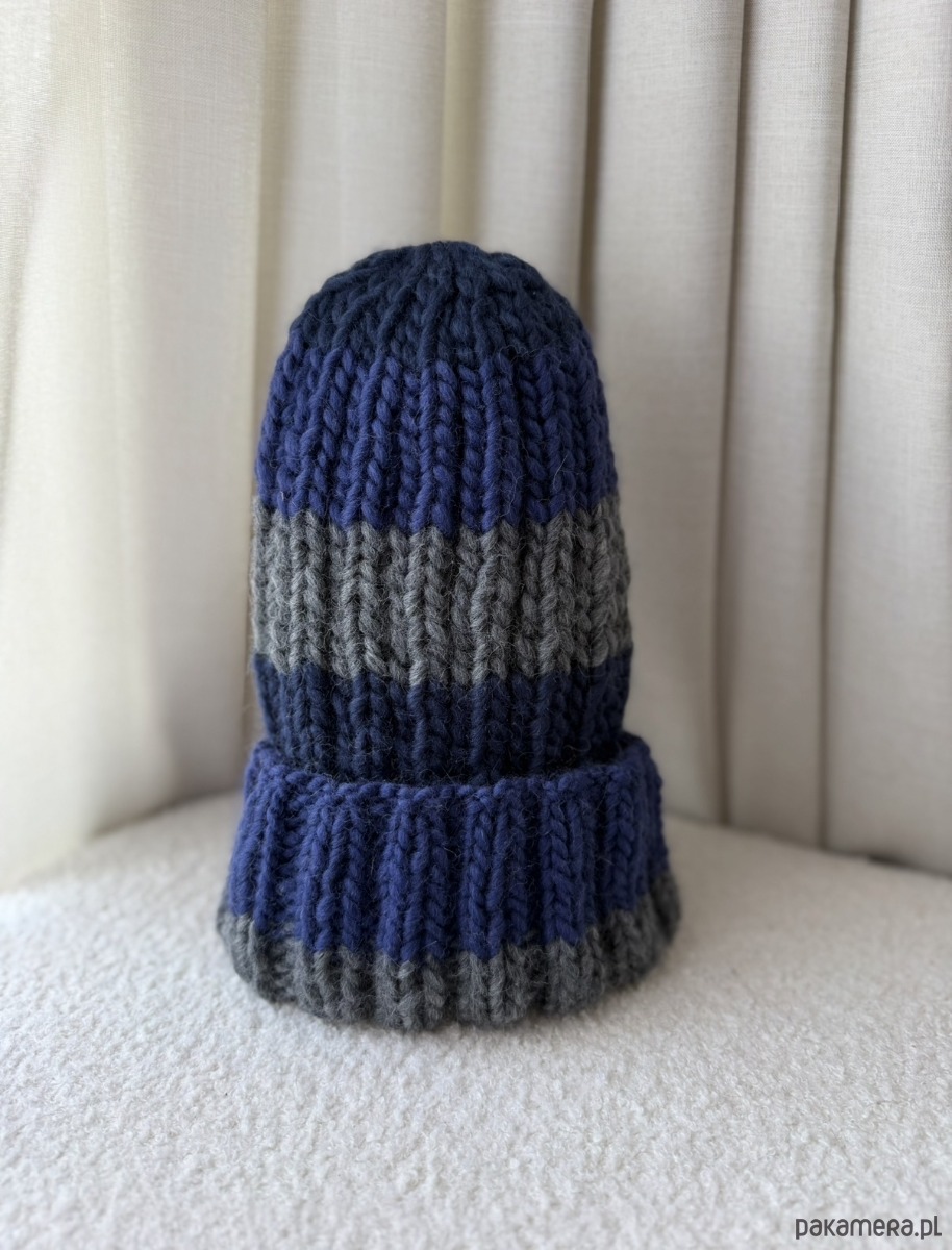 Czapka w kolorze niebieskim granatowym i szarym, wykonana z naturalnej włóczki 100% wełna.