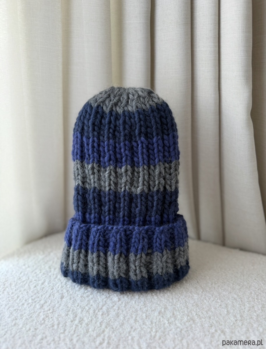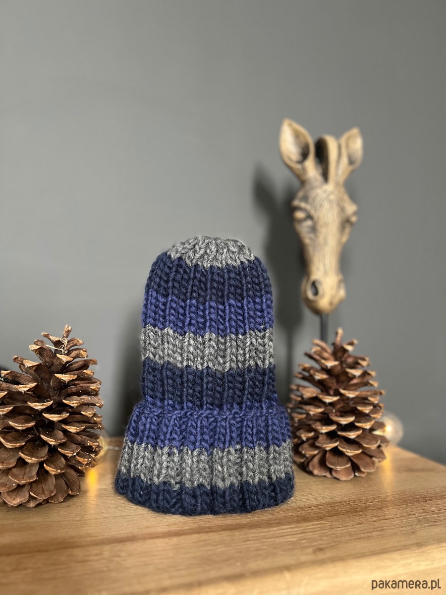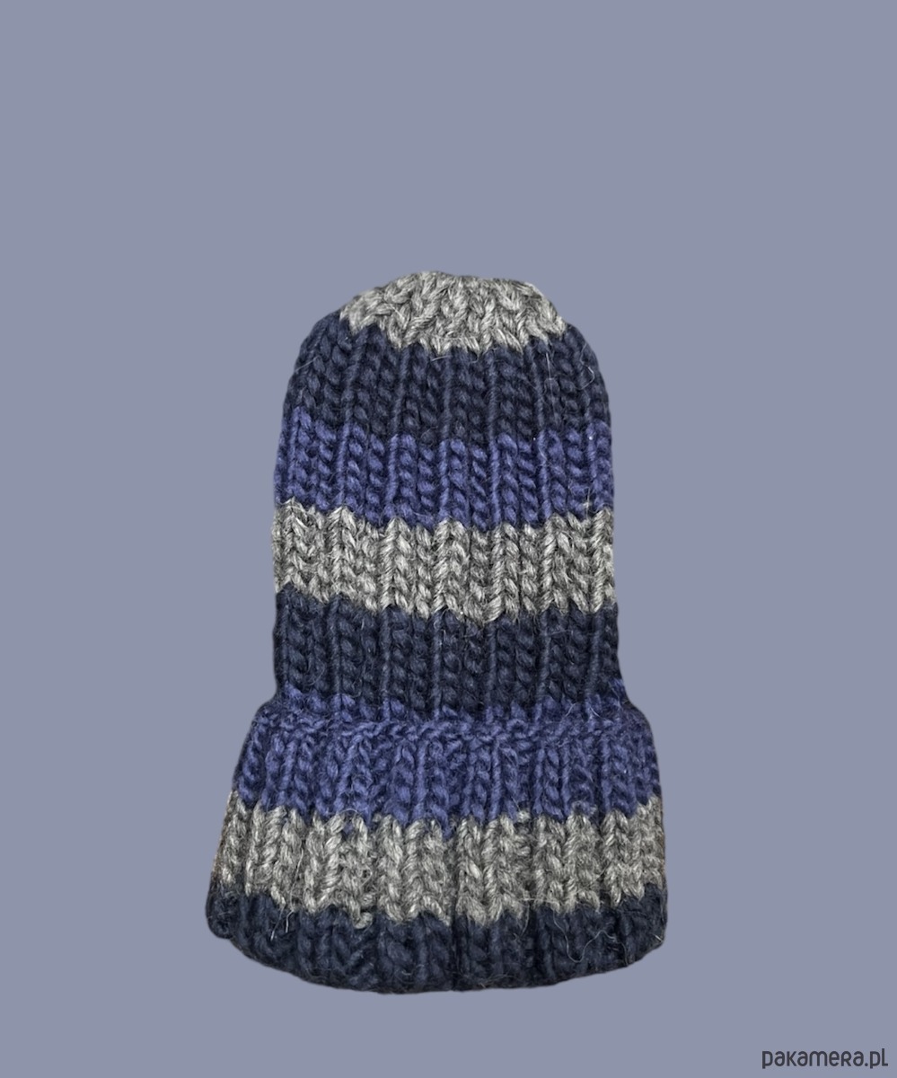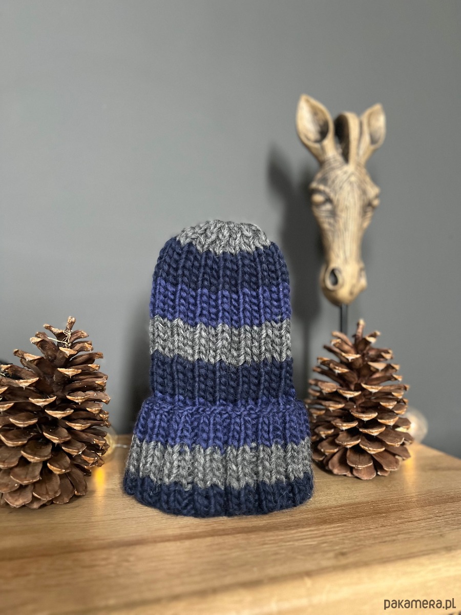 Czapka w kolorze niebieskim granatowym i szarym, wykonana z naturalnej włóczki 100% wełna.