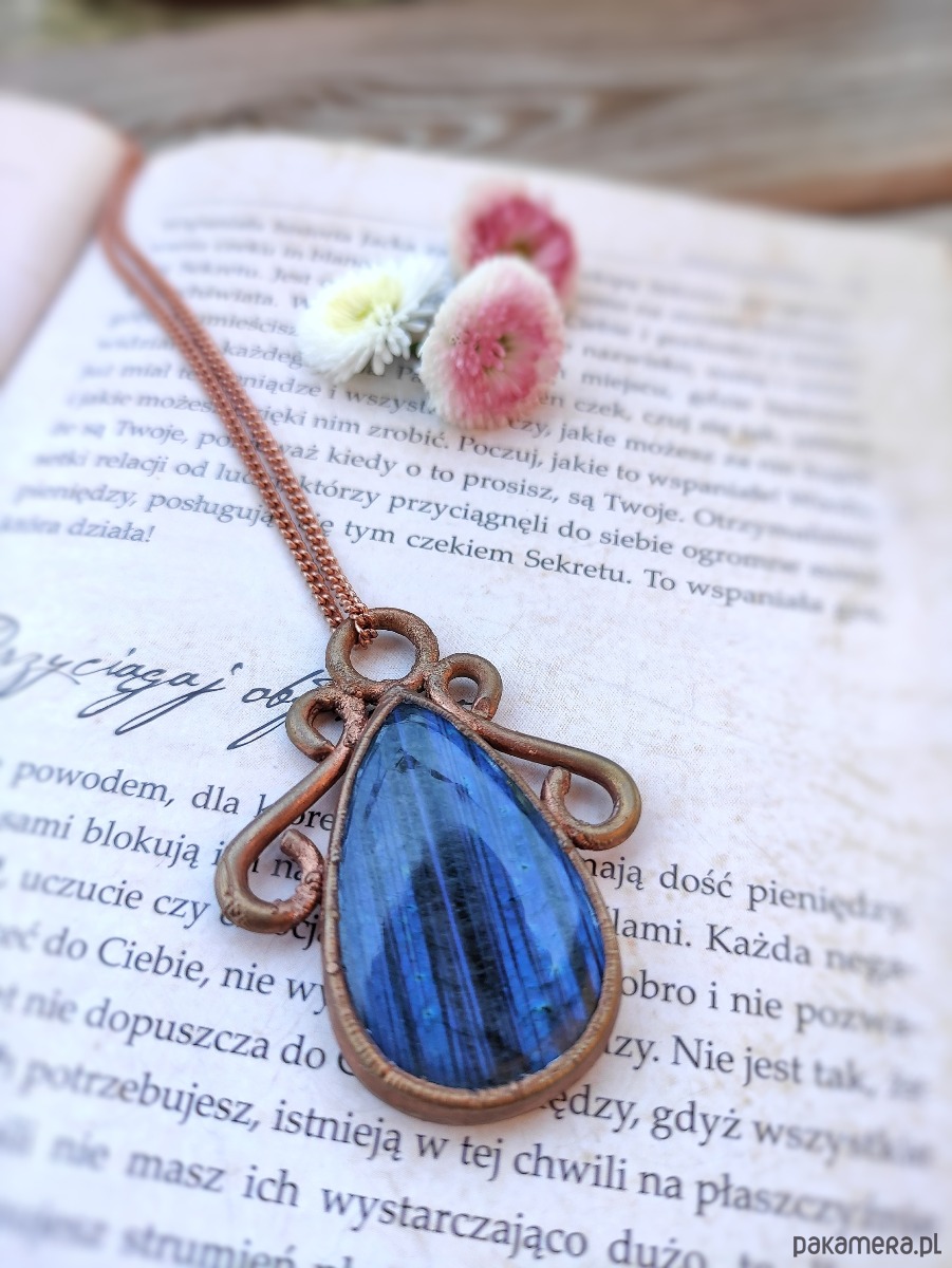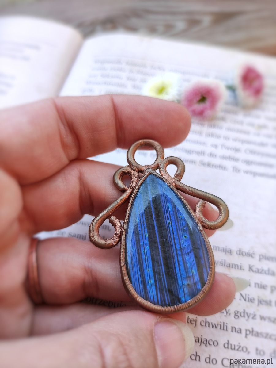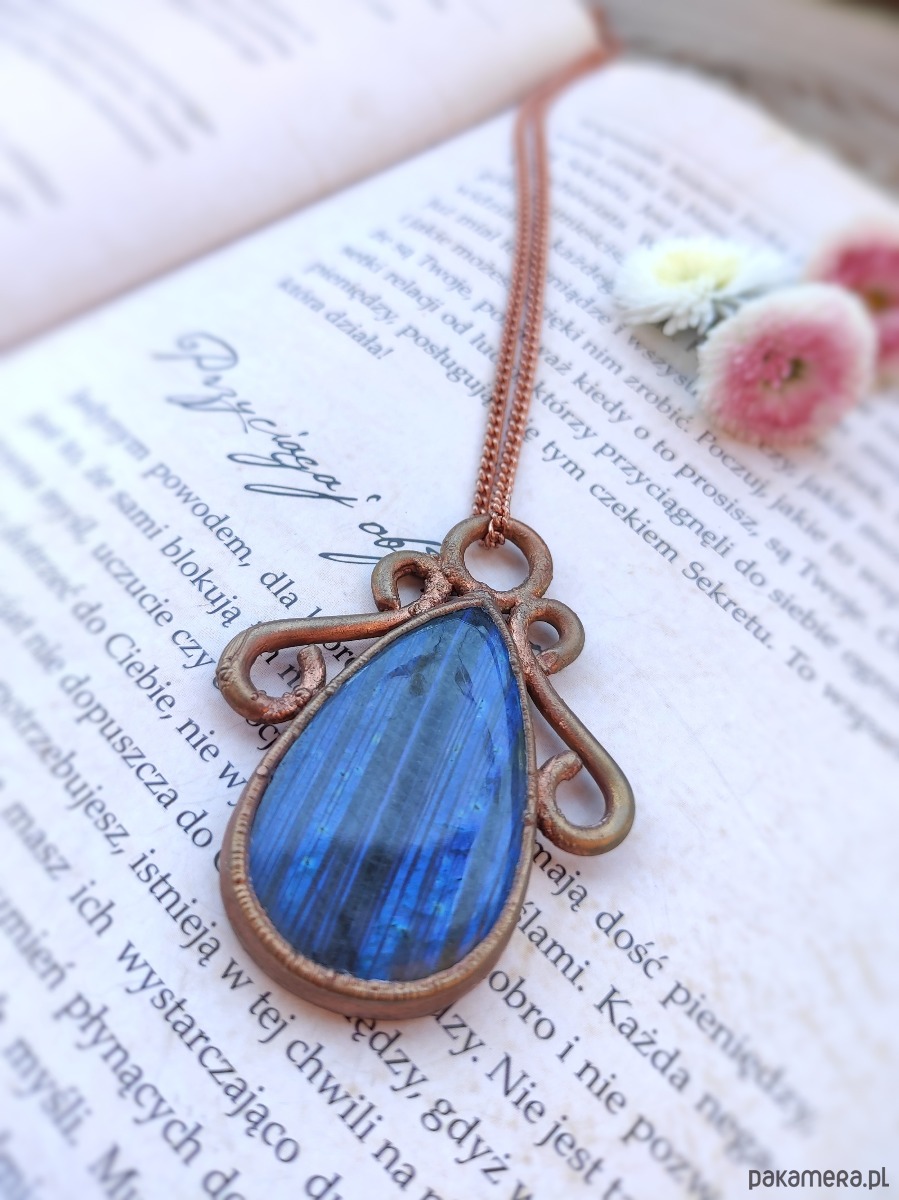 Ręcznie wykonany wisiorek z niebieskiego labradorytu to biżuteria, która łączy w sobie siłę natury i magię rzemiosła. Powstał w technice elektroformowania – miedź została osadzona warstwa po warstwie, tworząc oprawę harmonijnie podkreślającą unikalny kształt kamienia. Każdy detal jest wynikiem uważnej pracy i organicznego procesu, dzięki czemu każdy egzemplarz pozostaje niepowtarzalny.