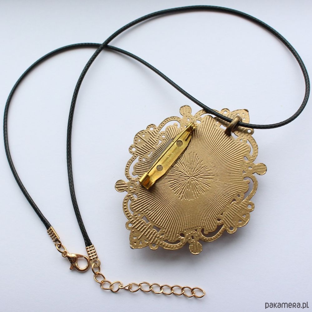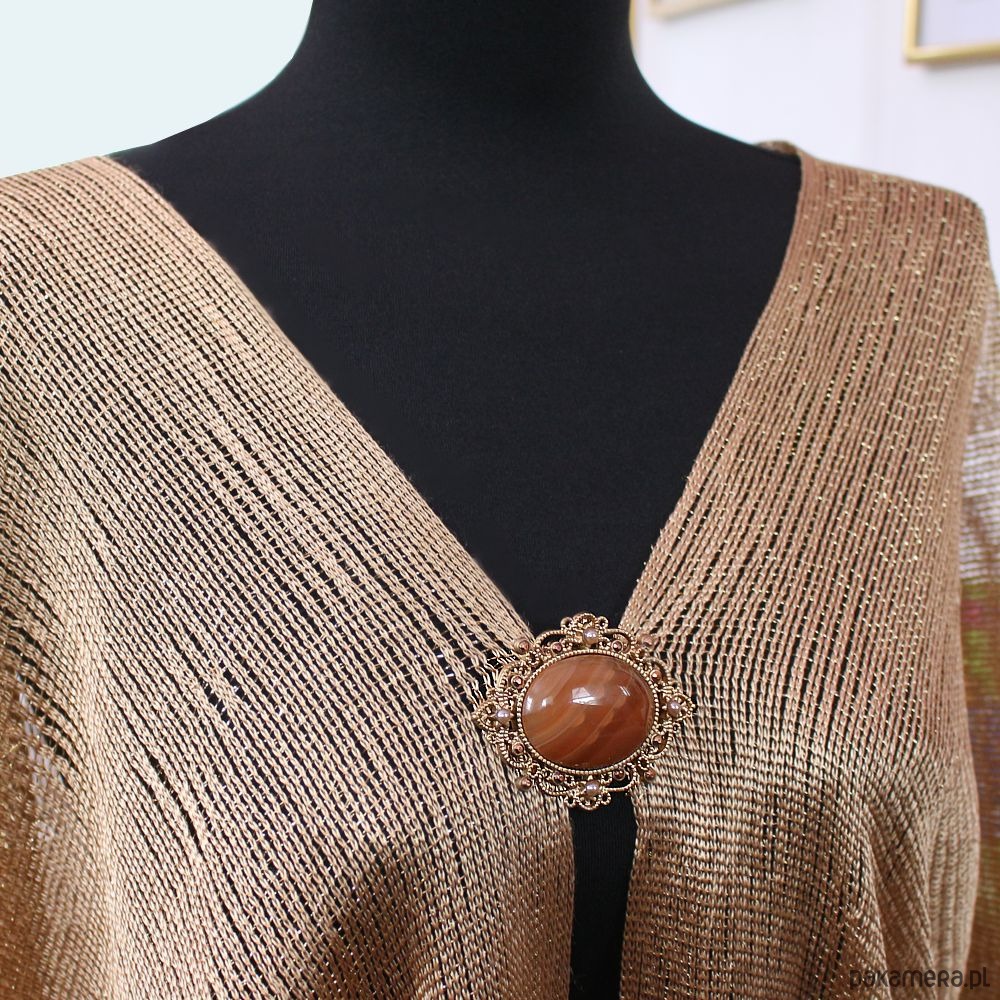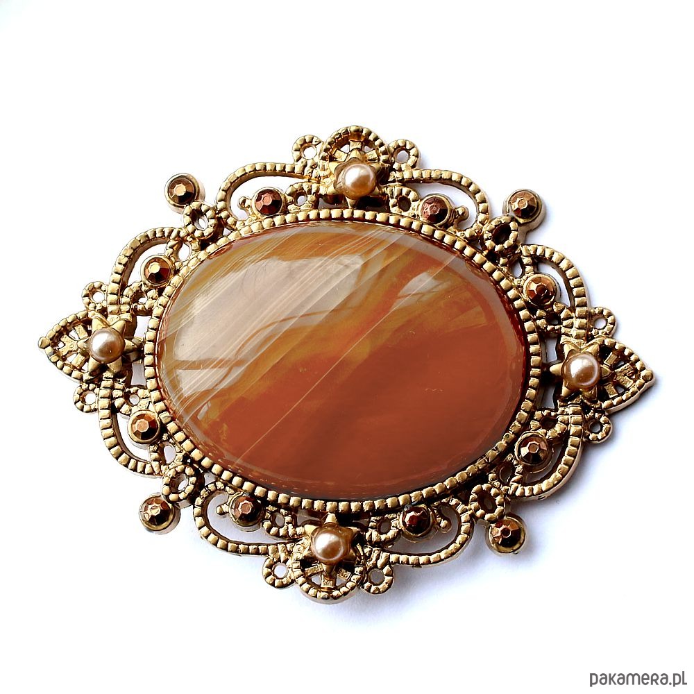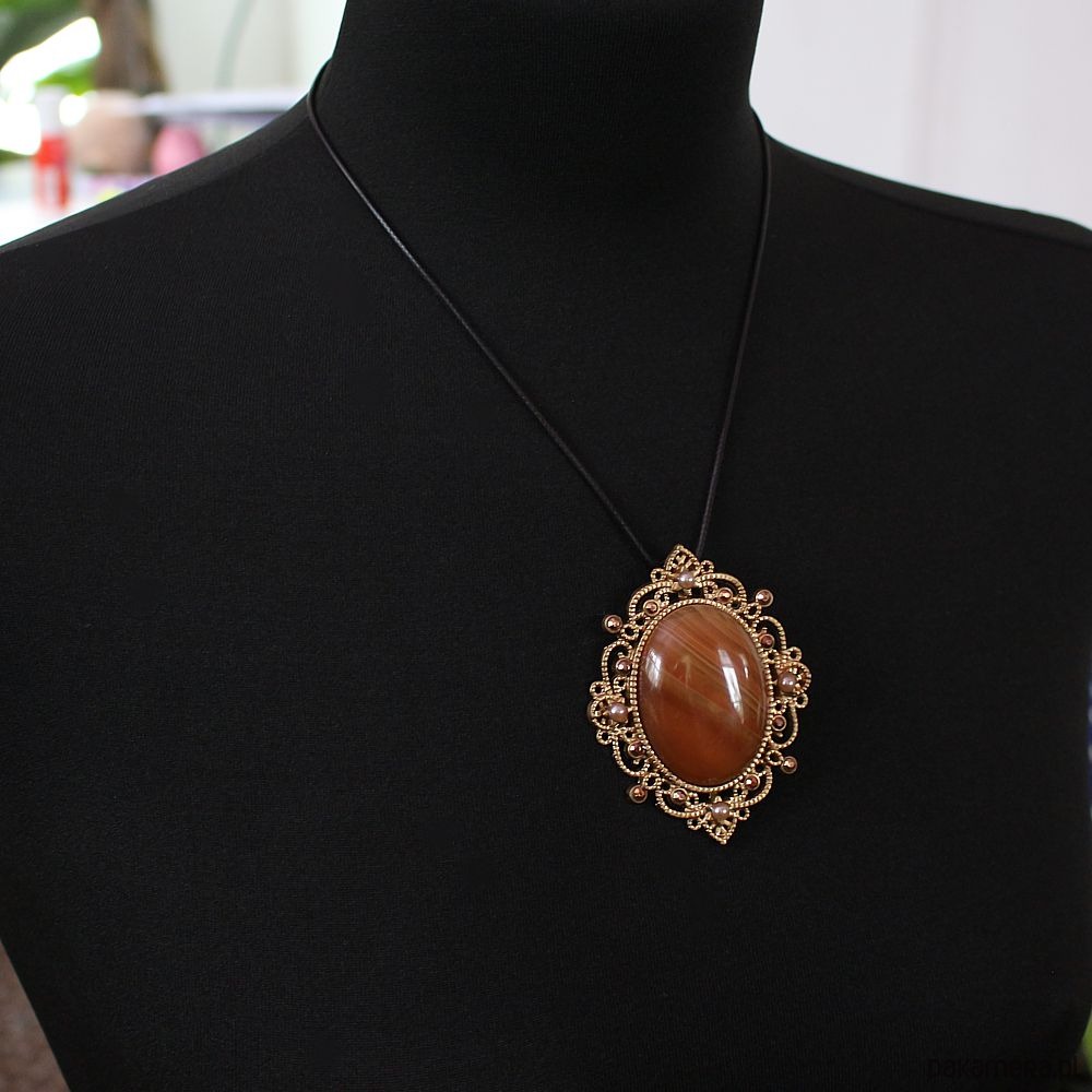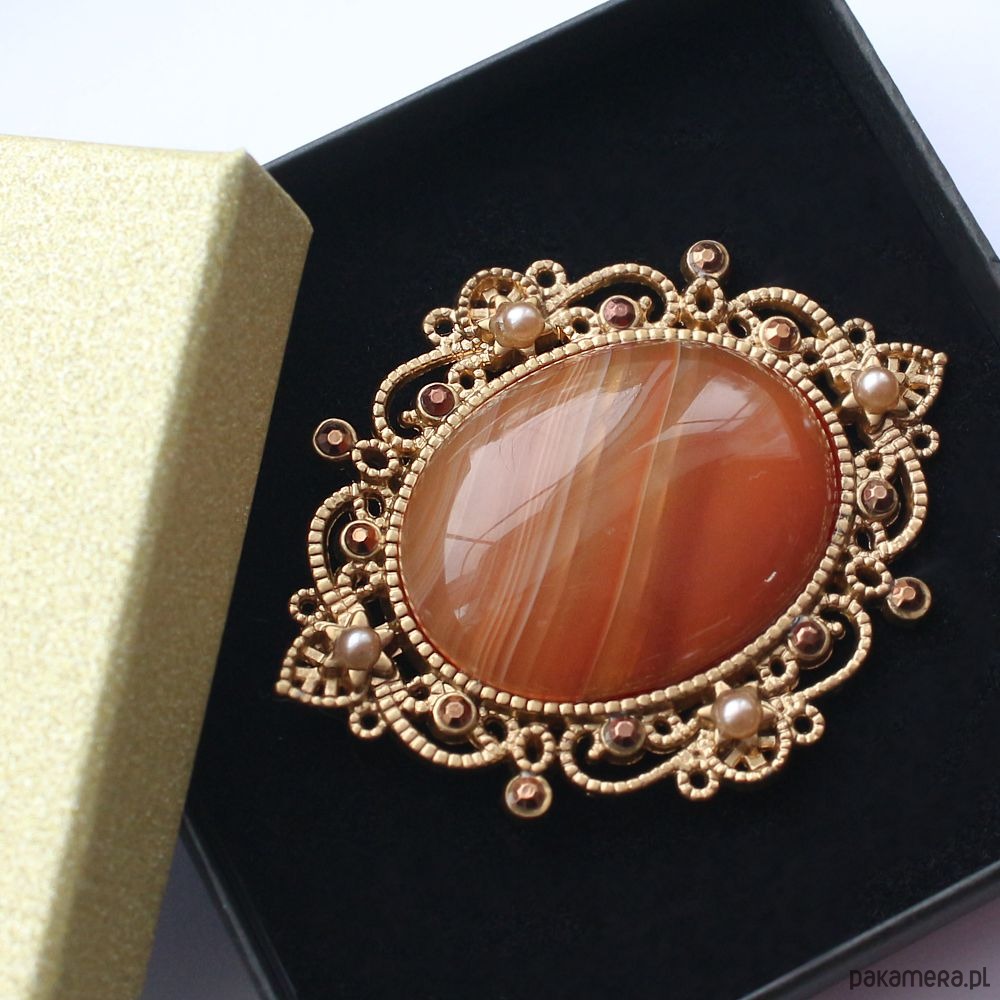 2 w 1: broszka lub wisior w zależności od Twojego nastroju! Agat ognisty na stylowej ażurowej bazie w odcieniu antycznego złota, stop cynku i miedzi bez ołowiu i kadmu. Ozdobiona perełkami w odcieniu szampańskim i jetami jablonex w odcieniach brązu. W komplecie rzemyk z eko skórki z przedłużką zapinany na karabińczyk.