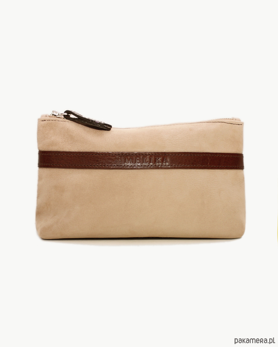 Mała kosmetyczka zamszowa która, pomieści kosmetyki kolorowe i inne drobiazgi. Ozdobiona dodatkami z naturalnej skóry licowej. Komora kosmetyczki zamykana jest na metalowy suwak.