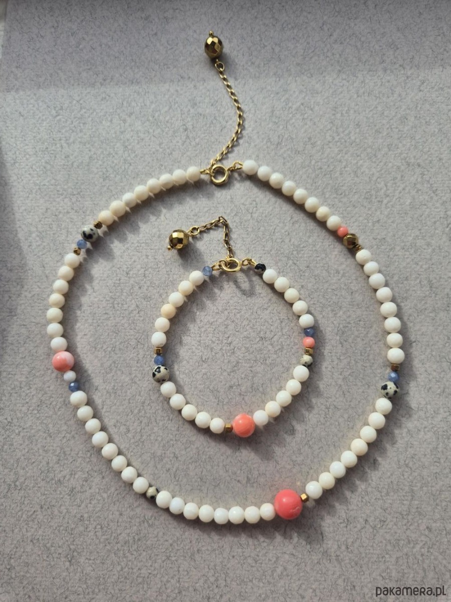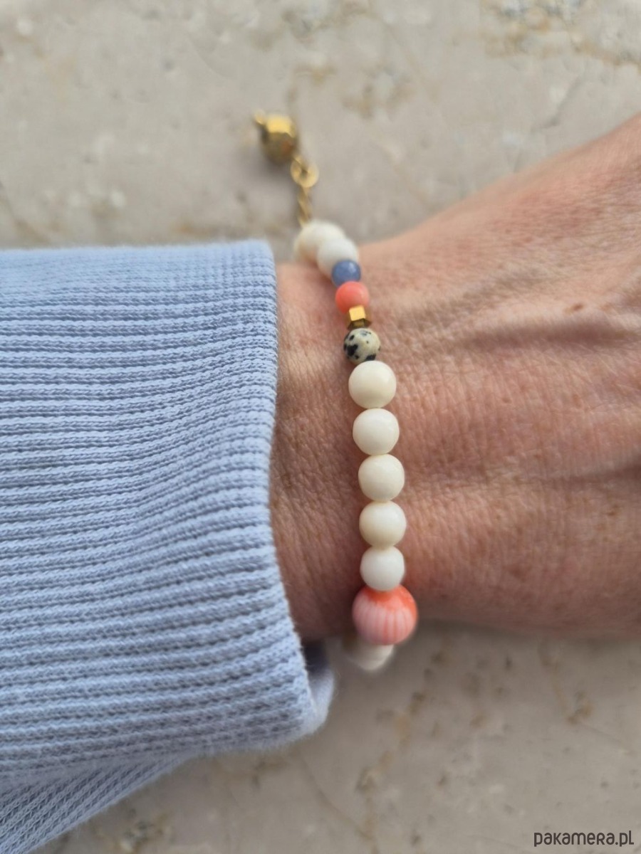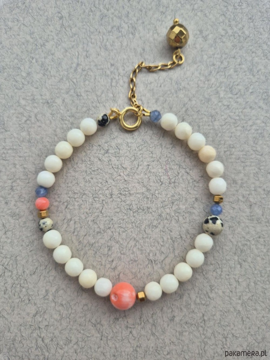 Bransoletka Happy to ręcznie wykonana, pastelowa kompozycja z naturalnych kamieni, która przyciąga subtelną elegancją i świeżością kolorów. Powstała z białych korali, uzupełnionych akcentami błękitnych szafirów, różowych korali oraz charakterystycznego jaspisu dalmatyńskiego o delikatnym, „zwierzęcym” wzorze. Całość przełamują złote hematyty, które dodają jej blasku i lekkości, niczym promienie wiosennego słońca.