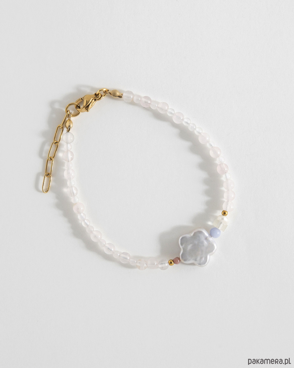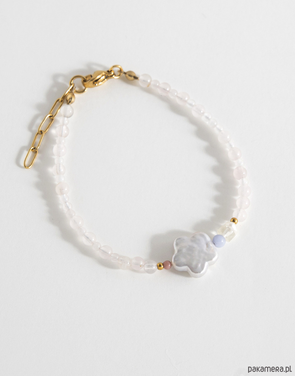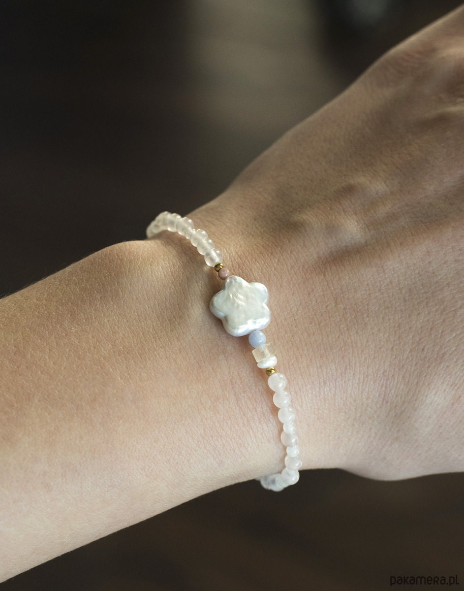 Ręcznie wykonana bransoletka z kamieni naturalnych oraz pereł. Główną bazę stanowi różowy kryształ górski. W centralnej części znajdują się kamienie o różnych wielkościach - agat, rodonit, kryształ górski oraz perły. Elementem dopełniającym jest kwiatek z perły naturalnej.