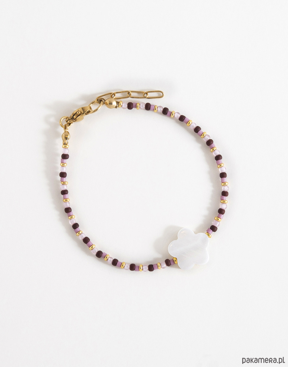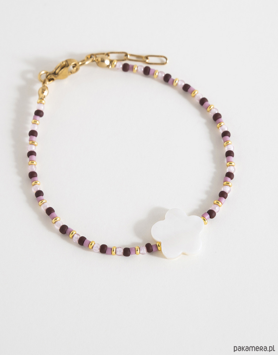 Bransoletkę wykonano ręcznie z różowej cyrkonii, przeplatanej szklanymi koralikami. Centralnym elementem jest kwiatek z masy perłowej. Bransoletka posiada regulację, dzięki czemu łatwo dopasować ją do nadgarstka.