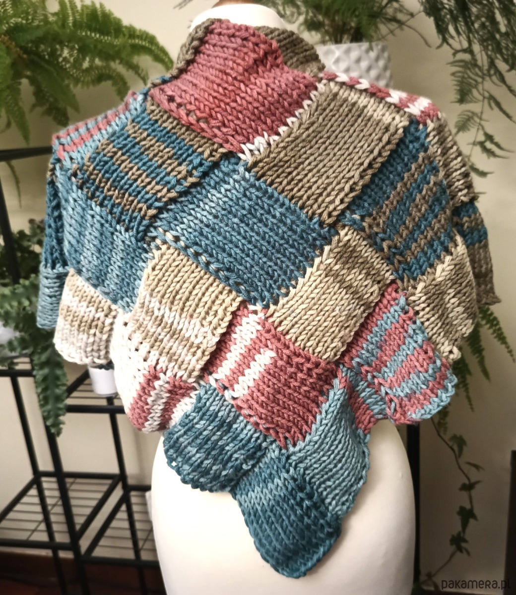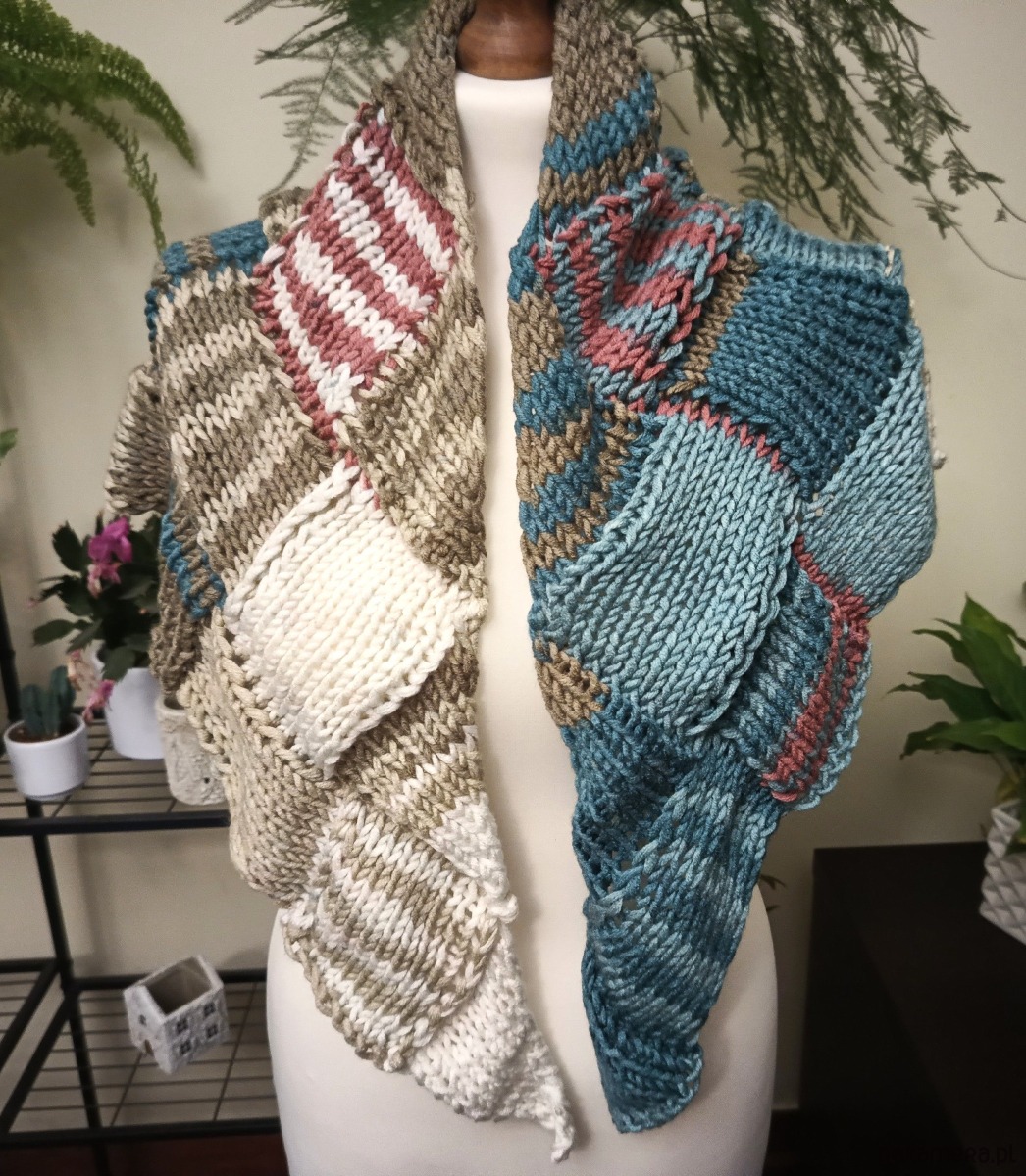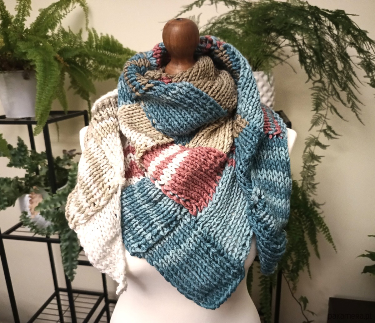 Chusta ma kształt trójkąta. Wykonałam ją ciekawym wzorem przypominającym plecionkę. Chusta Bandama stanowi świetny dodatek do każdej stylizacji. Można ją nosić na wiele sposobów, jako chustę na ramiona, na szyję lub chustę na głowę zastępującą czapkę.