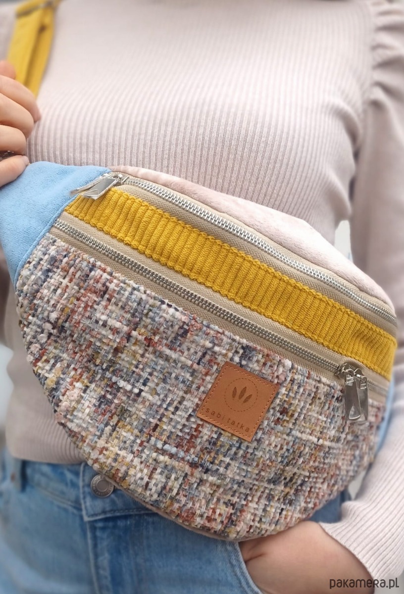 Bardzo duża nerka torebka damska z łączonych materiałów.