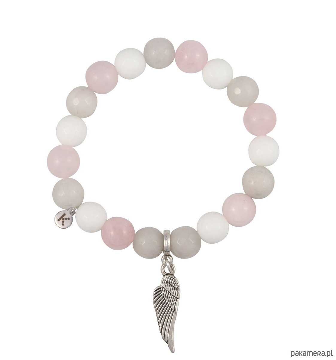 Wymiary: Kamienie: Agat szary/Agat biały/Kwarc różowy Wielkość kamieni: 10mmZawieszka: metal bezniklowyBlaszka z logo: 6mm
