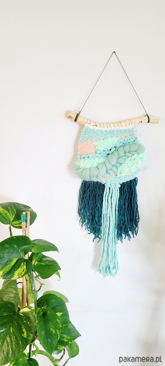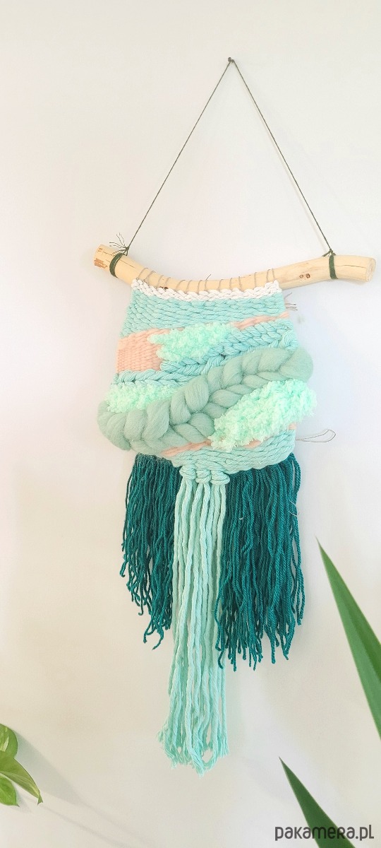 Ręcznie tkana dekoracja ścienna, która przywodzi na myśl spokojne fale i morską bryzę. Utrzymana w kojącej palecie miętowych, turkusowych i pudroworóżowych odcieni, tkanina tworzy delikatny pejzaż, który urozmaici Twoją przestrzeń.