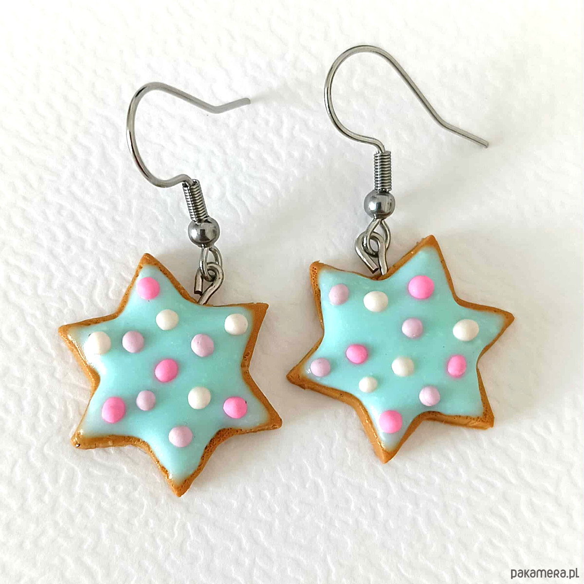 Urocze kolczyki w kształcie gwiazdkowych ciasteczek ozdobionych błękitnym lukrem i kolorowymi kropkami w pastelowych odcieniach różu, bieli i fioletu.