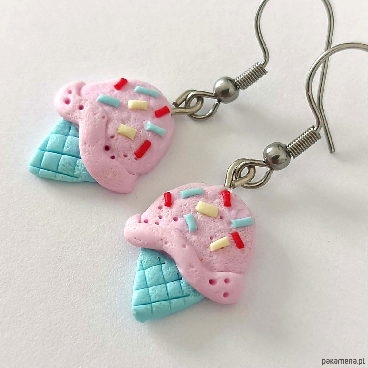 Urocze, ręcznie wykonane kolczyki w kształcie lodów w rożku. Delikatny róż połączony z błękitem oraz kolorową posypką tworzy słodki, lekki i bardzo dziewczęcy efekt