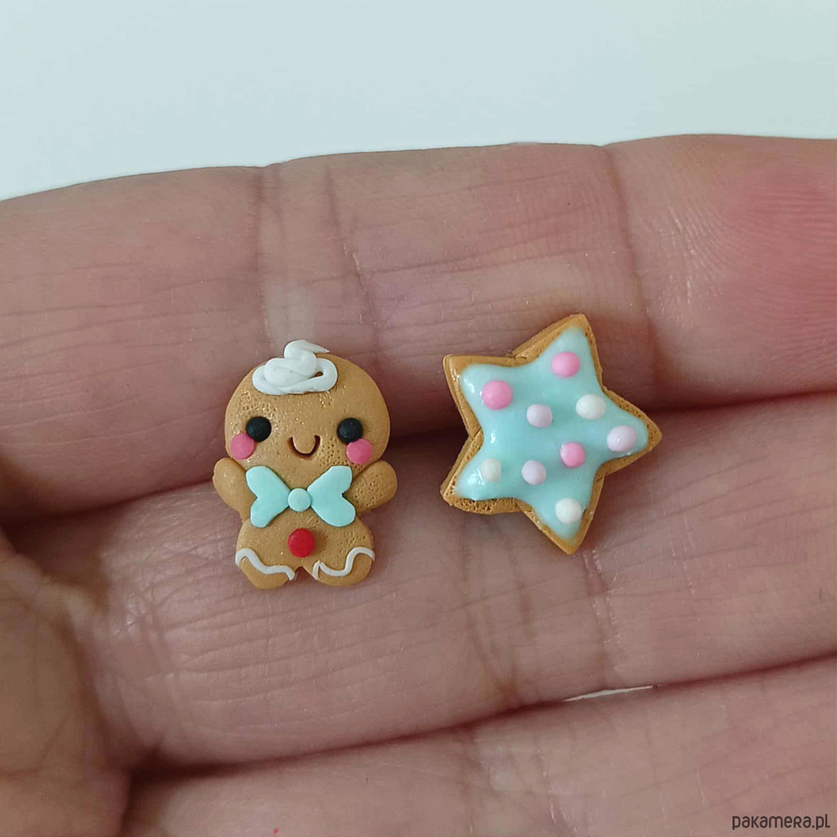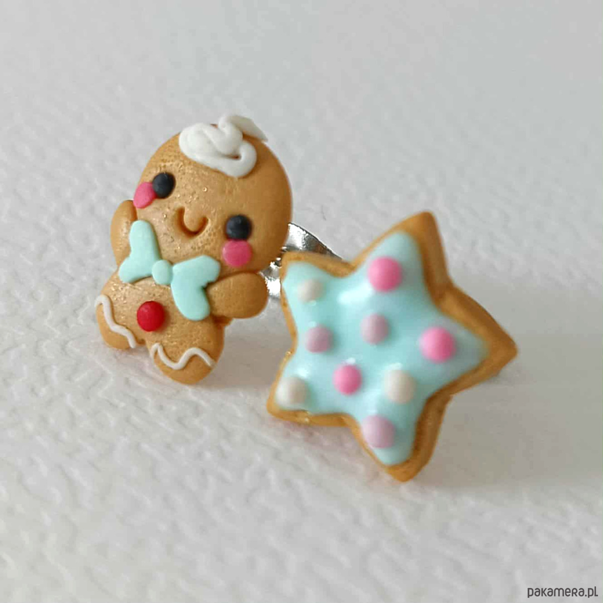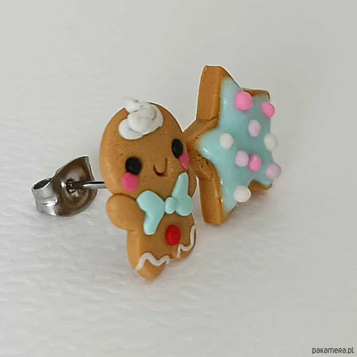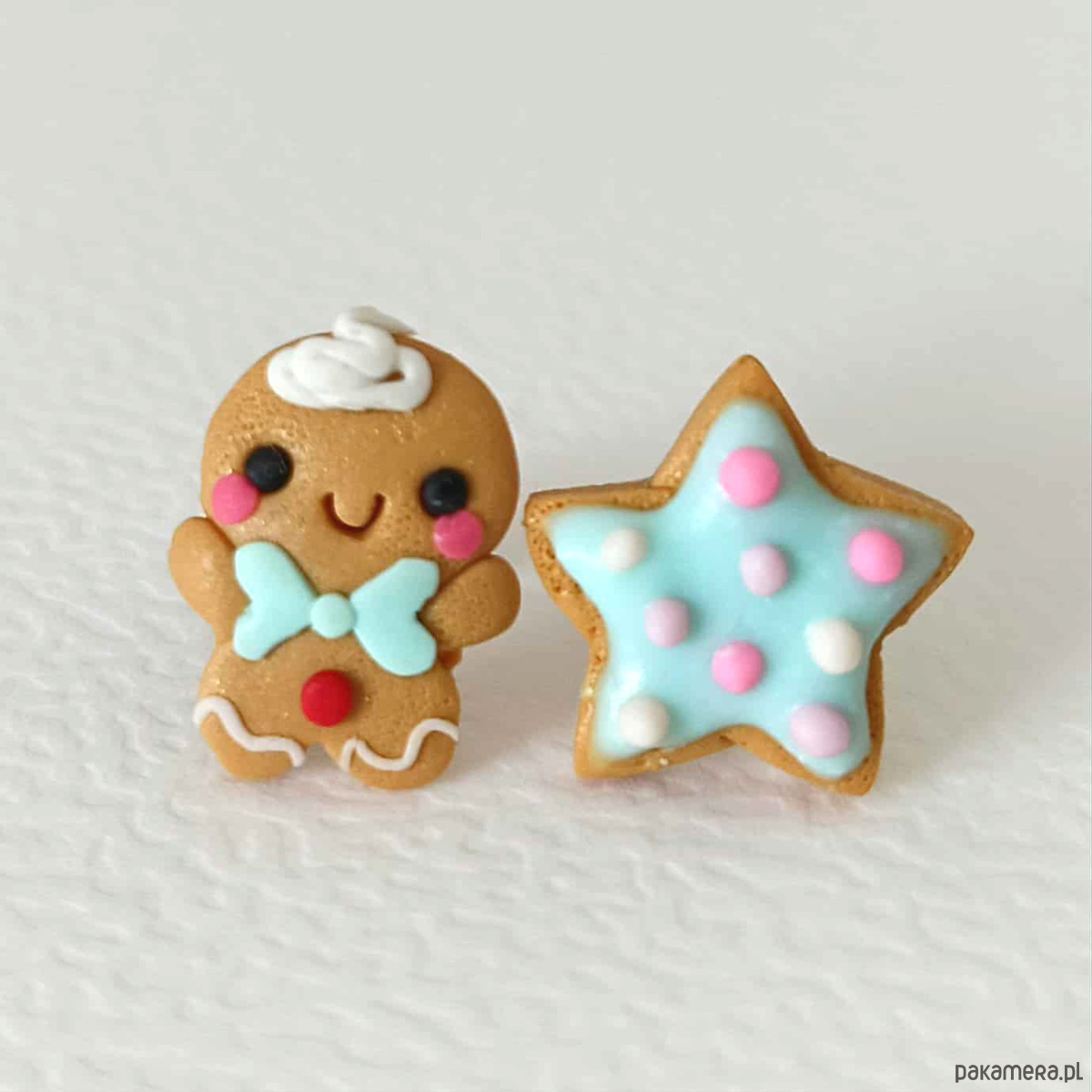 Kolczyki w kształcie wesołego pierniczka i gwiazdkowego ciasteczka z błękitnym lukrem i pastelowymi kropkami to idealny dodatek dla miłośniczek słodkich, oryginalnych ozdób.