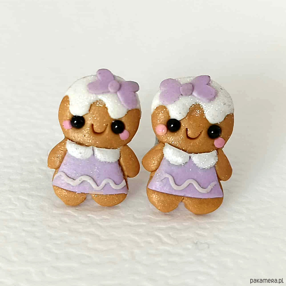 Kolczyki w kształcie wesołego pierniczka dziewczynki w fioletowej sukience to idealny dodatek dla miłośniczek słodkich, oryginalnych ozdób.