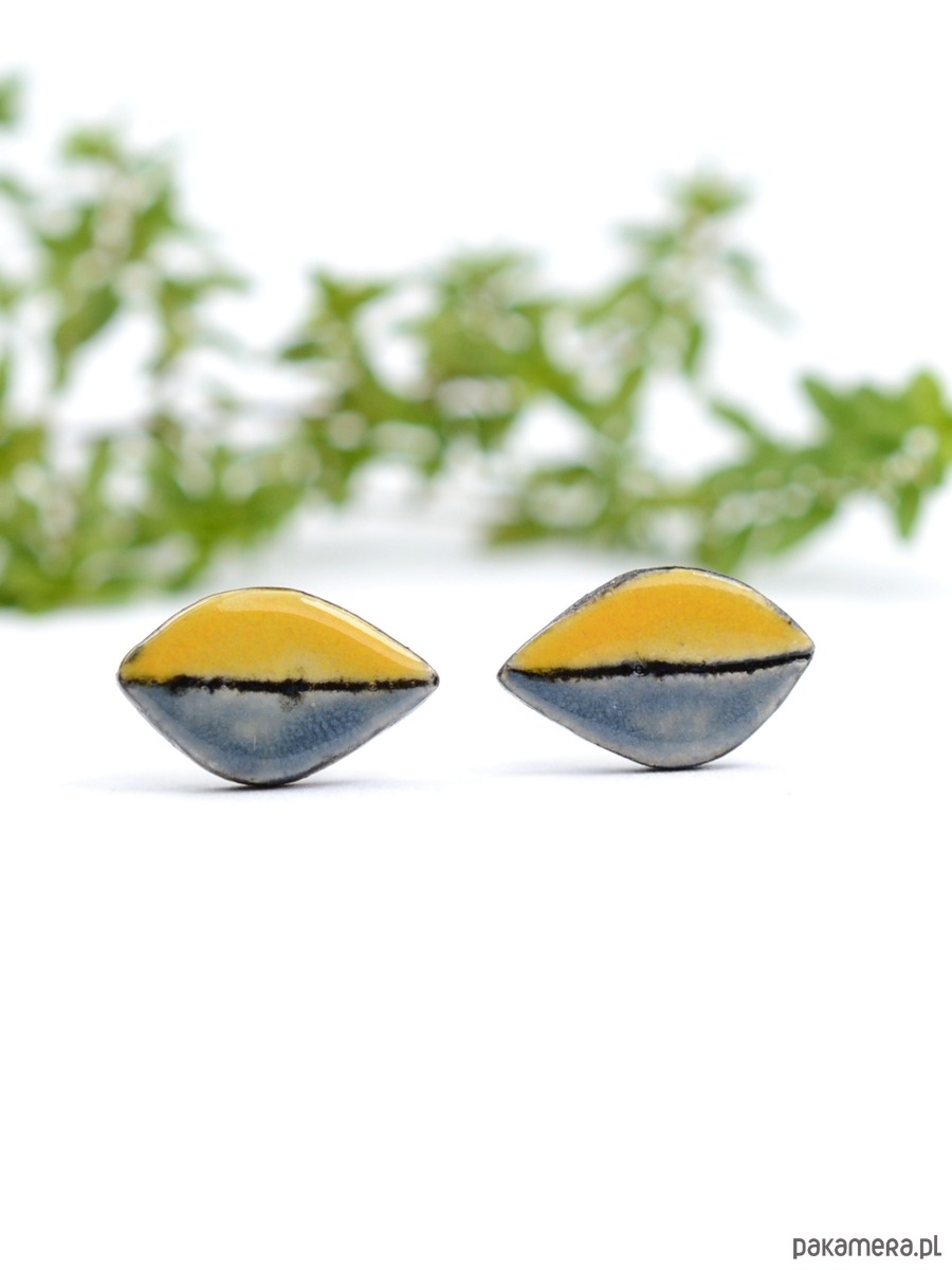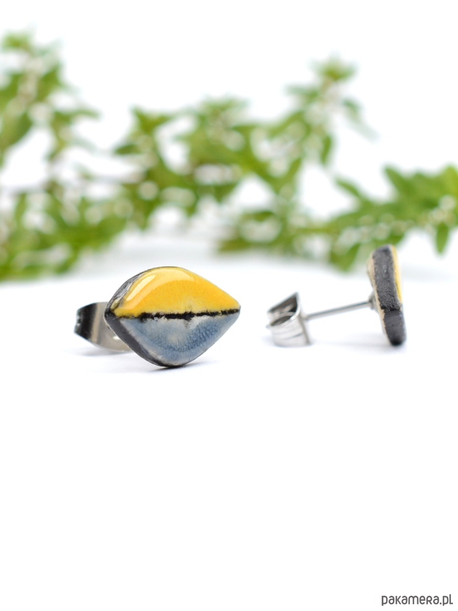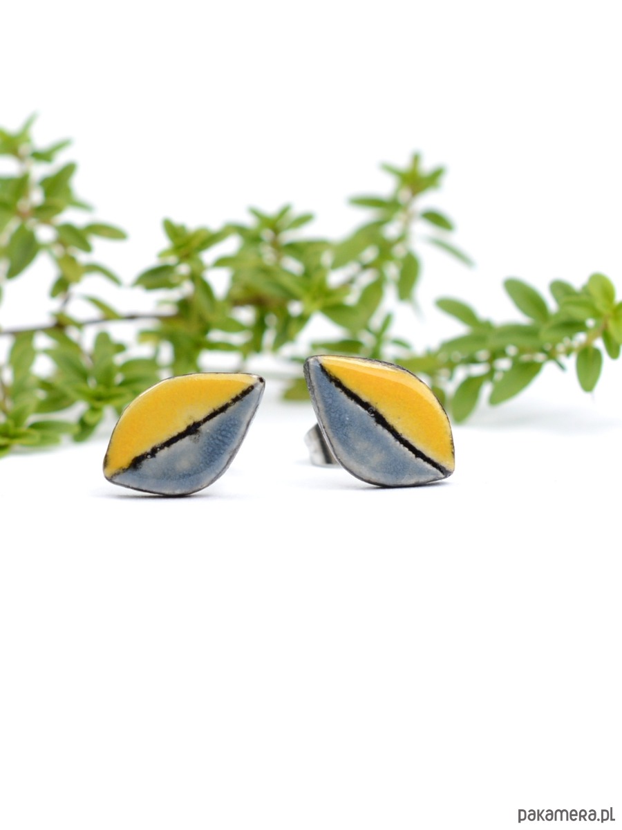 Kolczyki maja kształt listków a ich rozmiar to 14x9mm. Elementy ceramiczne zostały przeze mnie dopracowane w najmniejszym szczególe i są bardzo efektowne :))) Kolorystyka to ciepły żółty i szarość z dodatkiem czerni również na bocznych krawędziach. Kolczyki są solidnie umocowane na sztyftach ze stali chirurgicznej- antyalergiczna ,w kolorze oksydowanego srebra. Polecam!! Wysyłam w ozdobnym pudełku