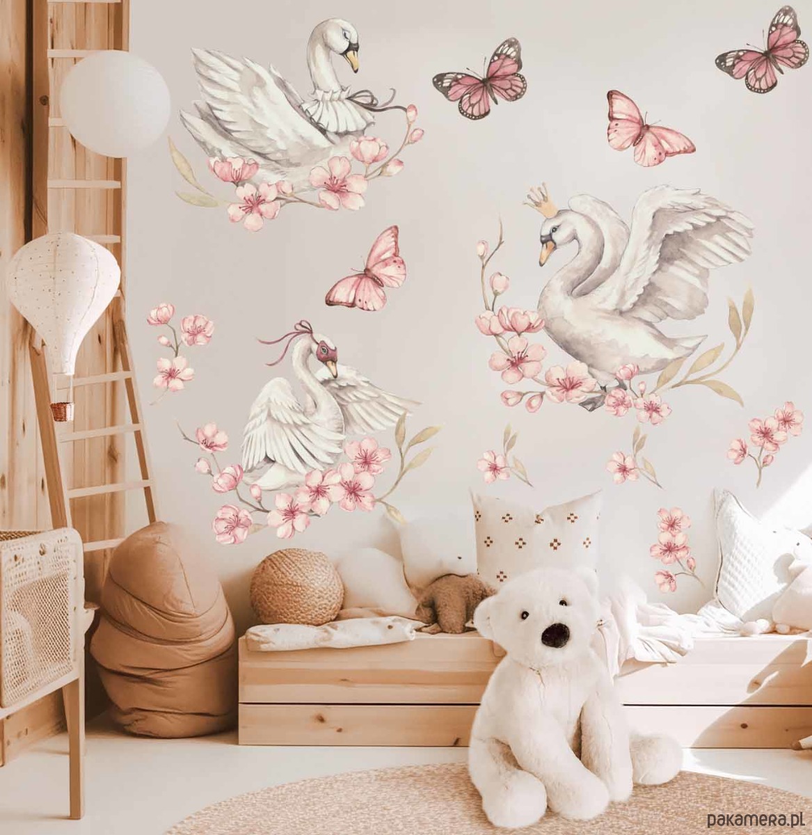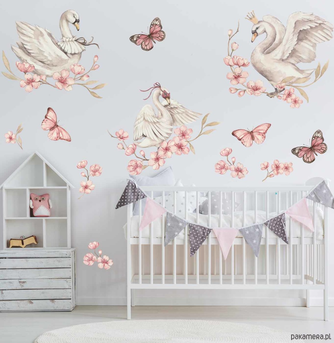 Autorski zestaw pastelowych naklejek ściennych z motywem łabędzi, motyli i kwiatów, przeznaczony do dekoracji pokoju dziewczynki. Wzór został ręcznie namalowany i przygotowany jako dekoracja dziecięcego wnętrza w jasnej, delikatnej kolorystyce.