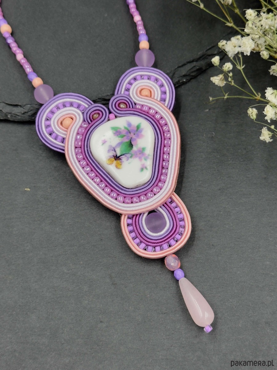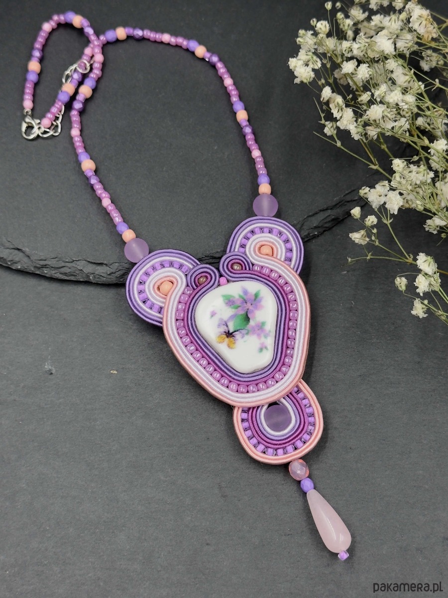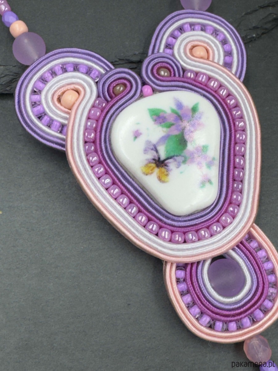 Delikatny, pastelowy naszyjnik wykonany techniką haftu sutasz. Centralnym elementem jest porcelanowy kaboszon z subtelnym motywem kwiatowym, otulony misterną haftowaną kompozycją sznurków i koralików w odcieniach fioletu, lawendy i pudrowego różu.