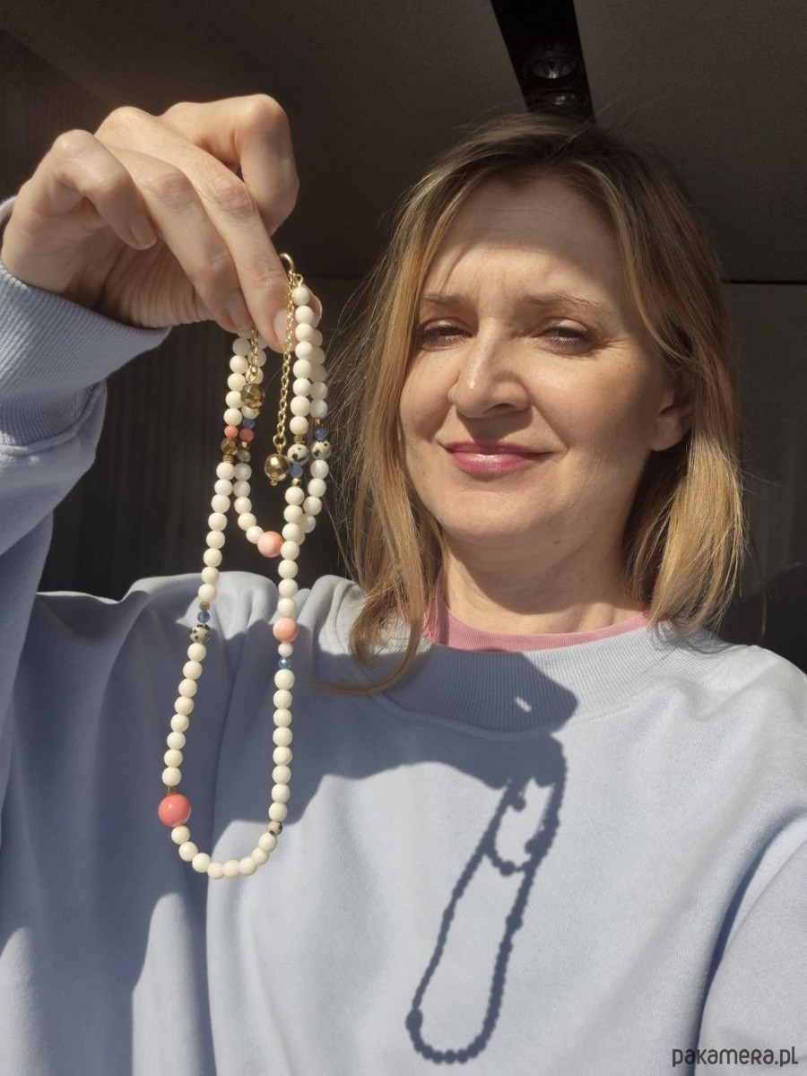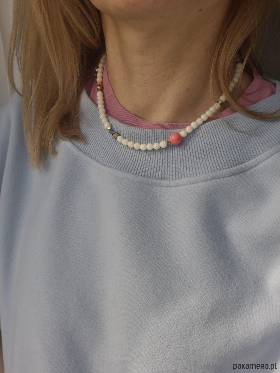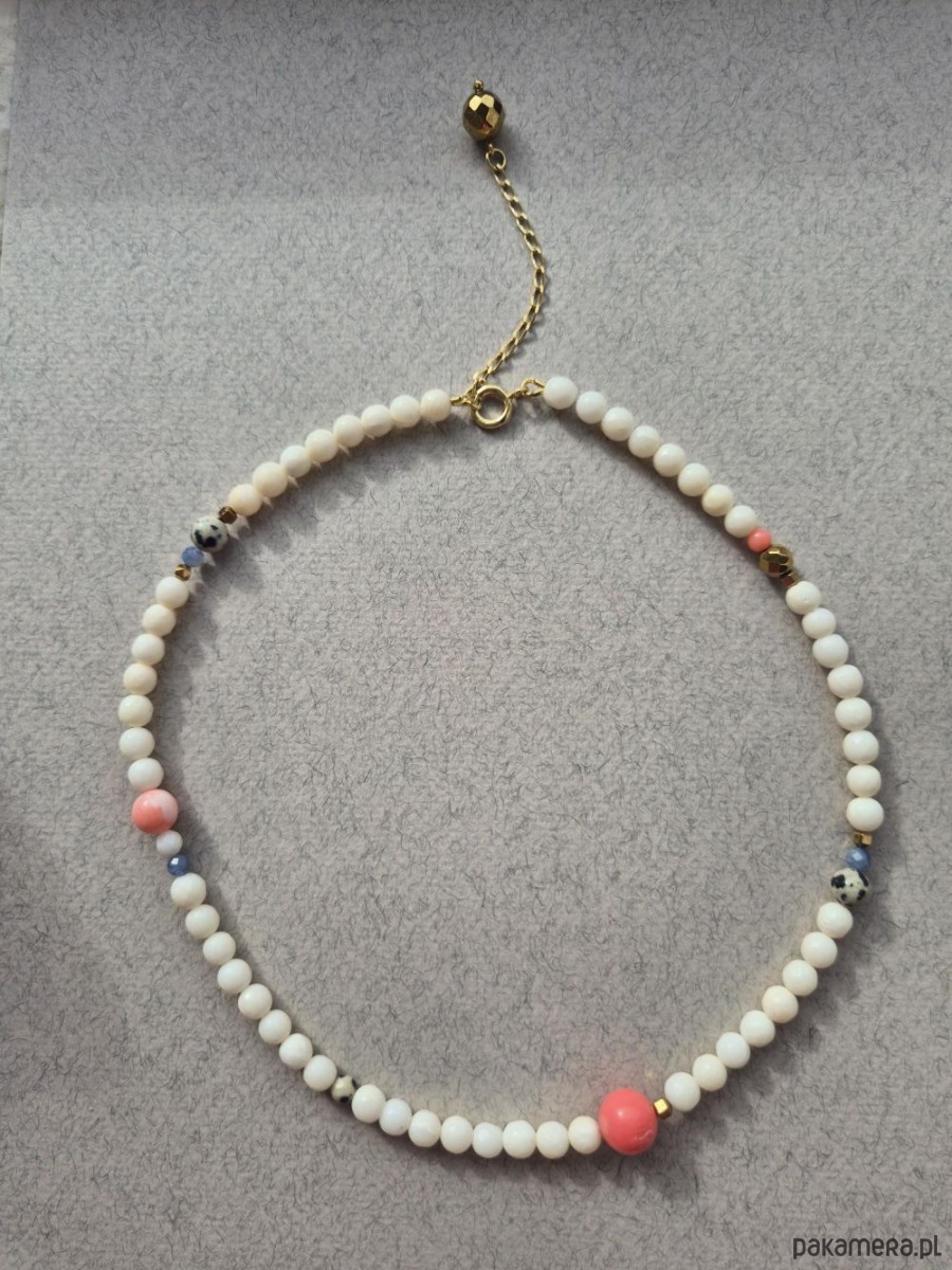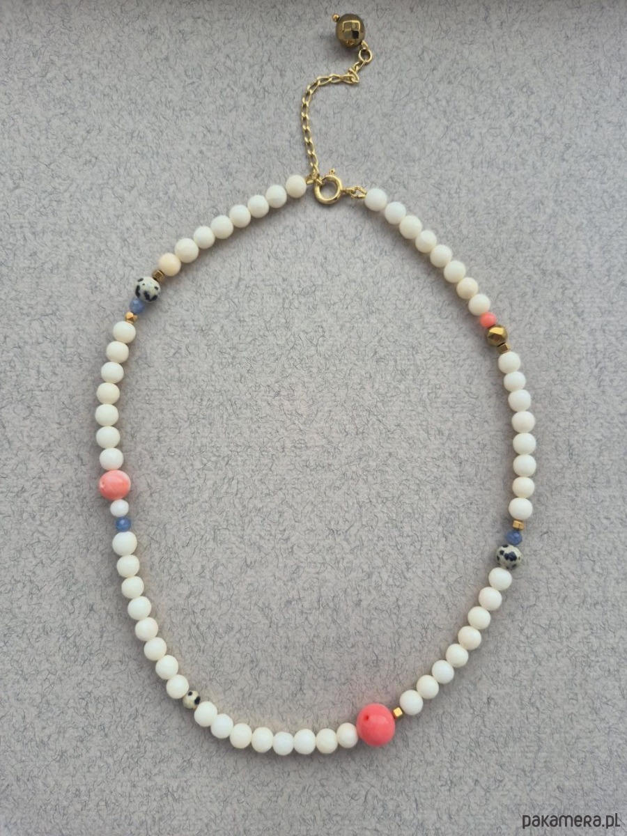 Pastelowy naszyjnik z białego koralu wykonany ręcznie, ozdobiony subtelnymi, kolorowymi akcentami. W kompozycji pojawiają się błękitne szafiry, różowe korale oraz jaspis dalmatyński o delikatnym, nieregularnym wzorze. Całość uzupełniają złote hematyty, które dodają lekkości i słonecznego blasku.