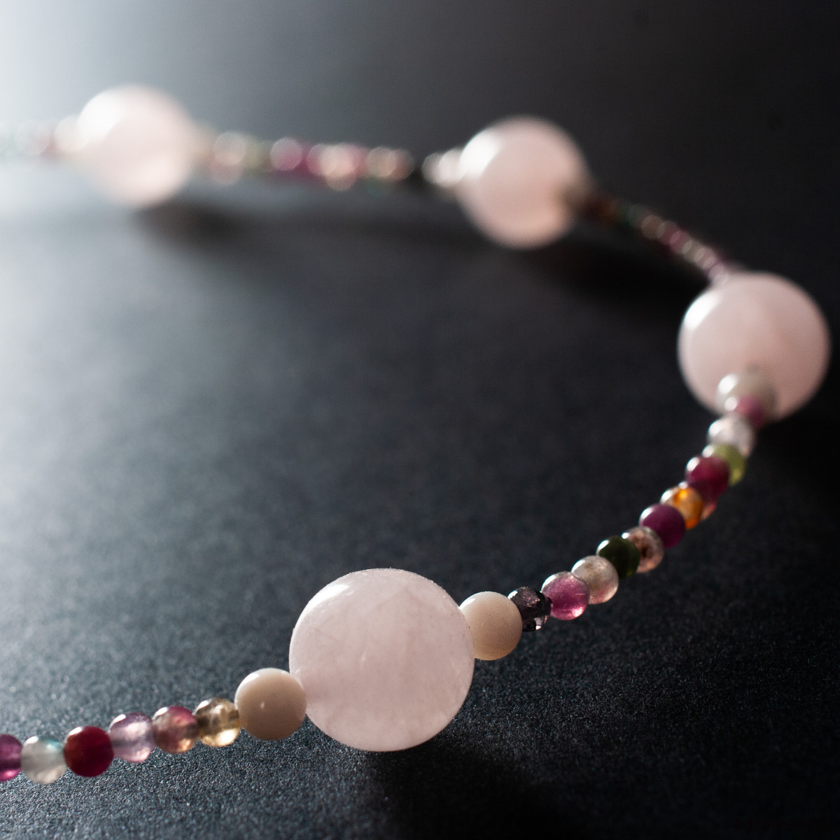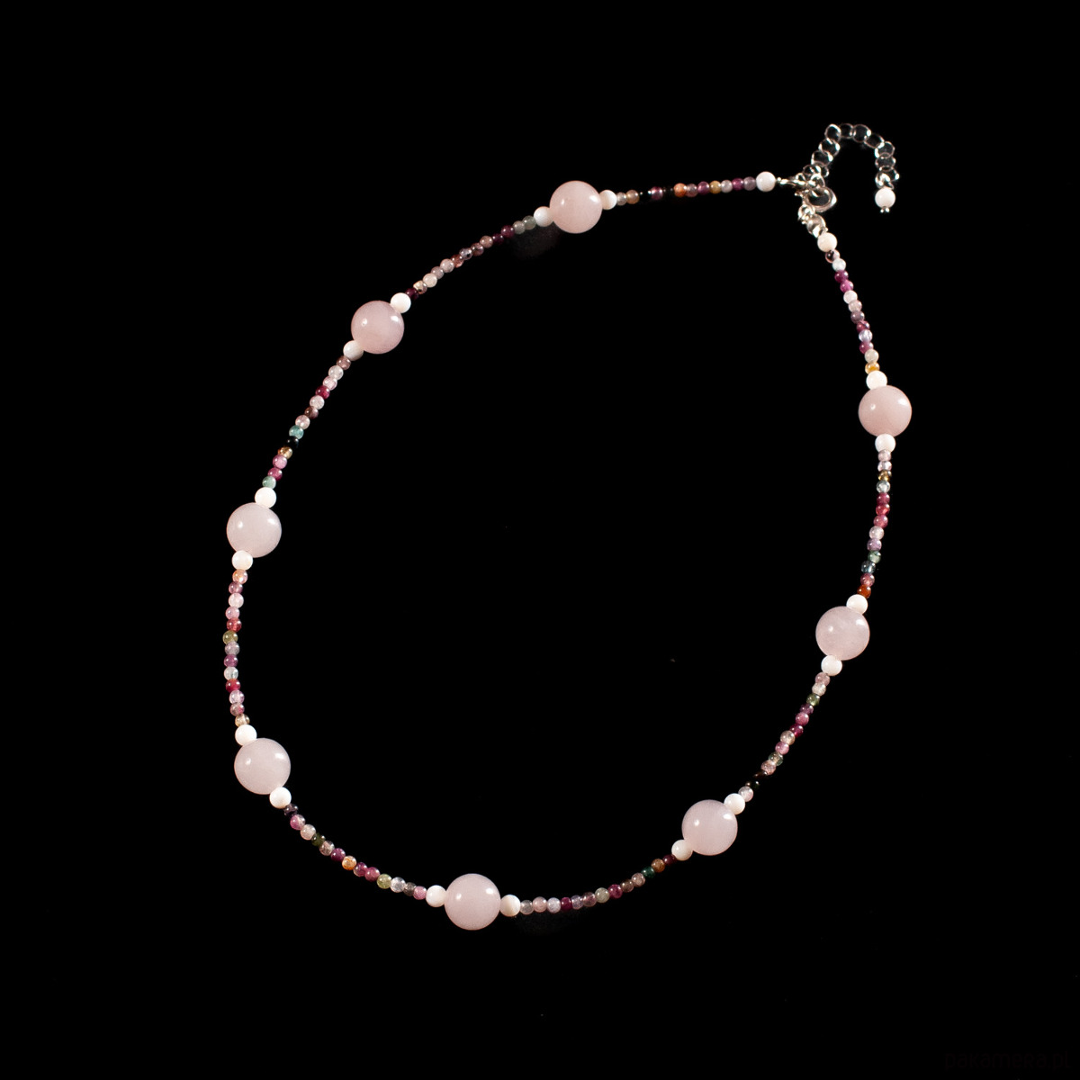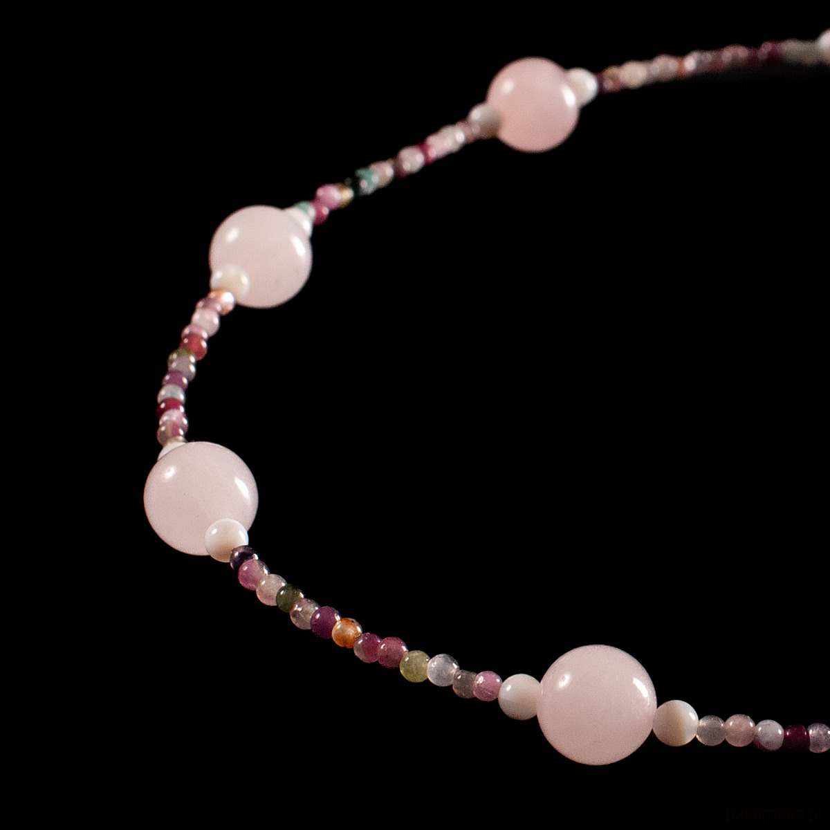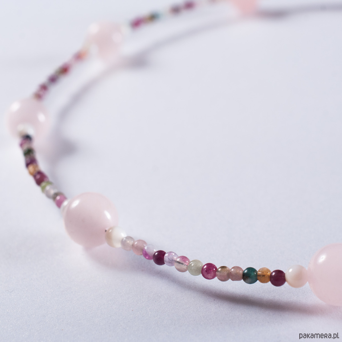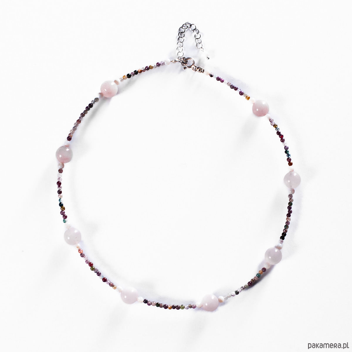 Pastelowy naszyjnik z kwarcem różowym, turmalinem i masą perłową. [PN17]