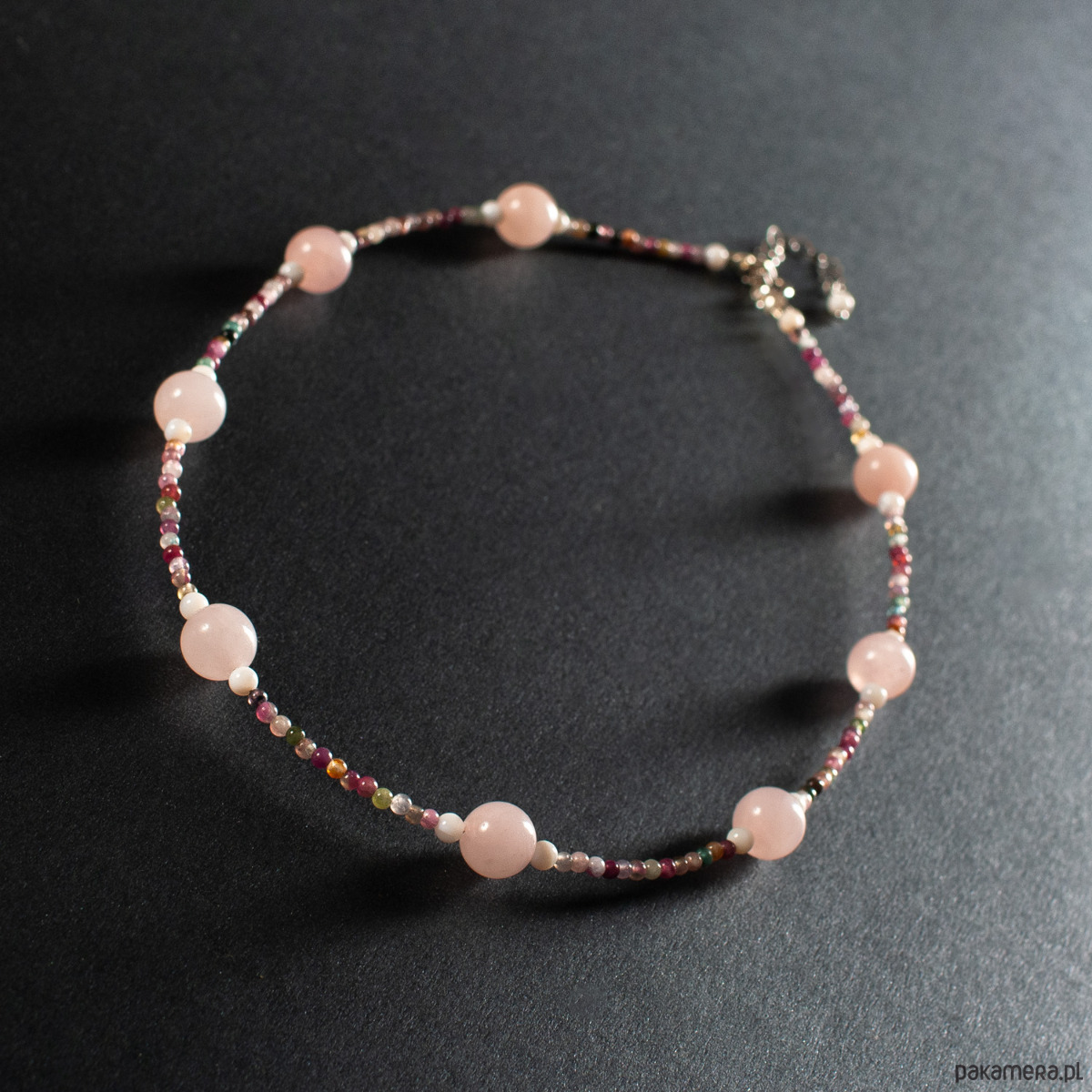 Naszyjnik z kolekcji JESTEŚ PERŁĄ. Piękne, delikatne, pastelowe odcienie różu turmalinów i kwarcu różowego dopełniają małe, białe koraliki z masy perłowej.Skład: kamienie naturalne 95%, srebro 925 2%, stal szlachetna 3%. Długość naszyjnika - 46 cm + łańcuszek (przedłużka) 5 cm. Biżuterię wykonujemy ręcznie, według własnego projektu w pracowni Anillo. Naszyjnik starannie zapakujemy i prześlemy w eleganckim kartoniku.