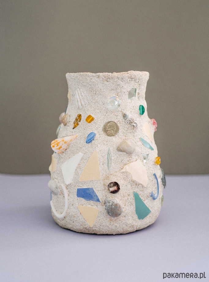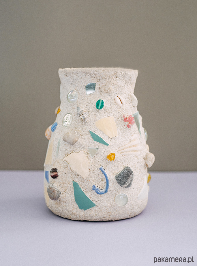 Wazon z mozaiką. Surowa struktura kontrastująca z dekoracyjnymi elementami.