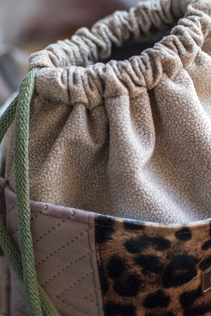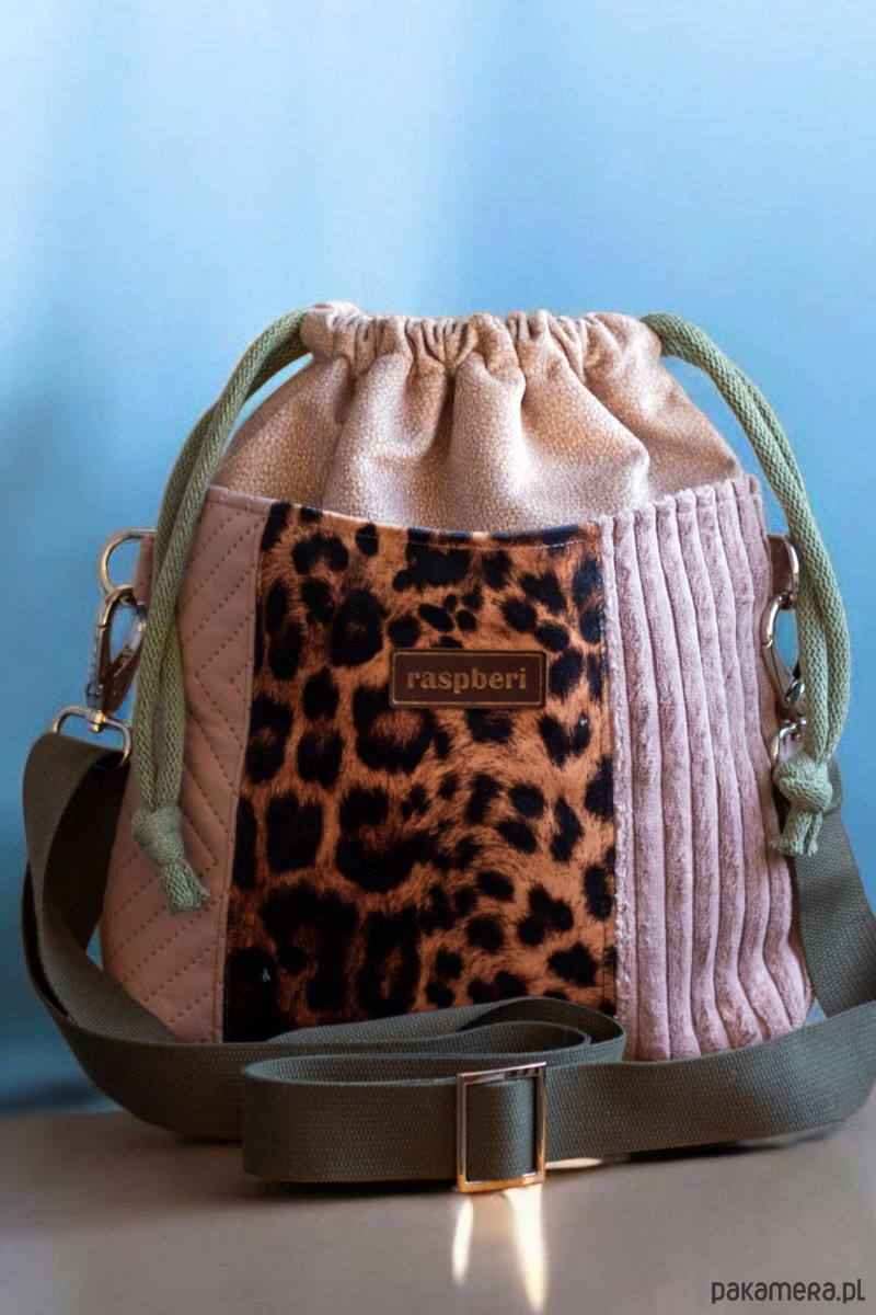 Wykonana z beżowego weluru. Z przodu oraz z na tyle torebki kieszenie (np. na telefon czy chusteczki) z pudroworóżowego grubego sztruksu, pikowanego weluru oraz weluru w panterkę. W środku kieszonka zapinana na suwak.