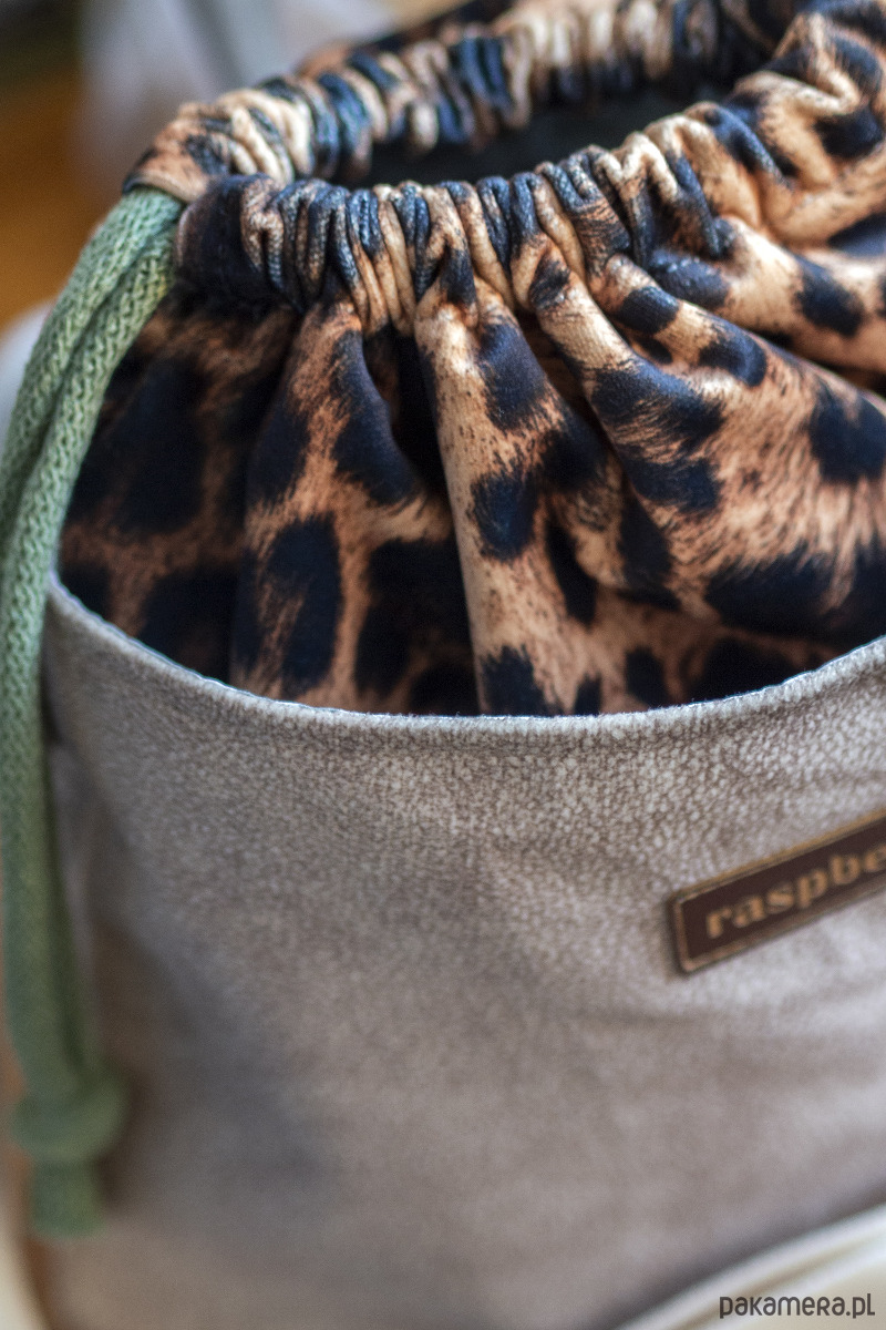 Wykonana z weluru w panterkę. Z przodu oraz z na tyle torebki kieszenie (np. na telefon czy chusteczki) z pudroworóżowego grubego sztruksu, pikowanego weluru, weluru w kolorze beżowym oraz weluru w panterkę. W środku kieszonka zapinana na suwak.