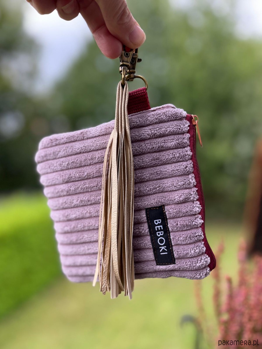 Frędzel ze złotej ekoskóry nadaje saszetce oryginalnego charakteru, a kosmetyczka z miękkiego sztruksu stanowi praktyczny dodatek.