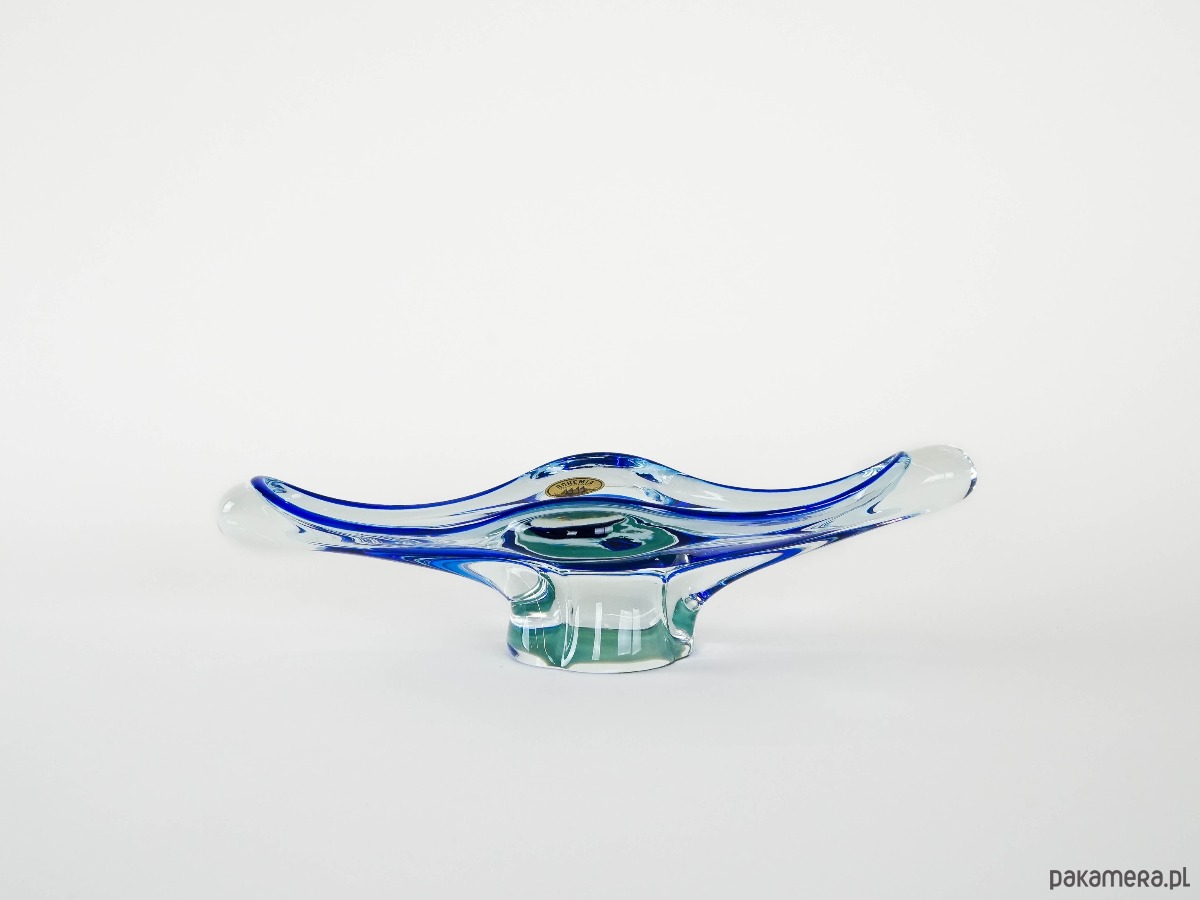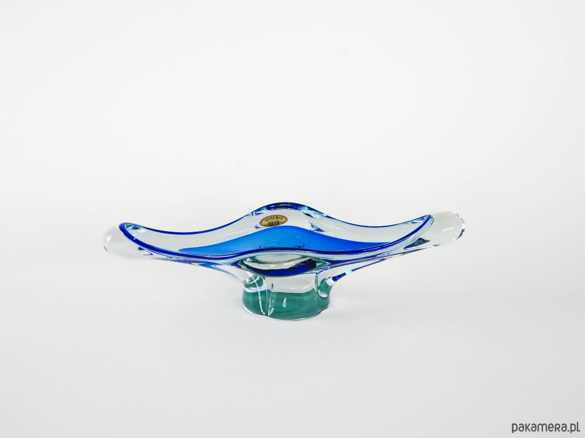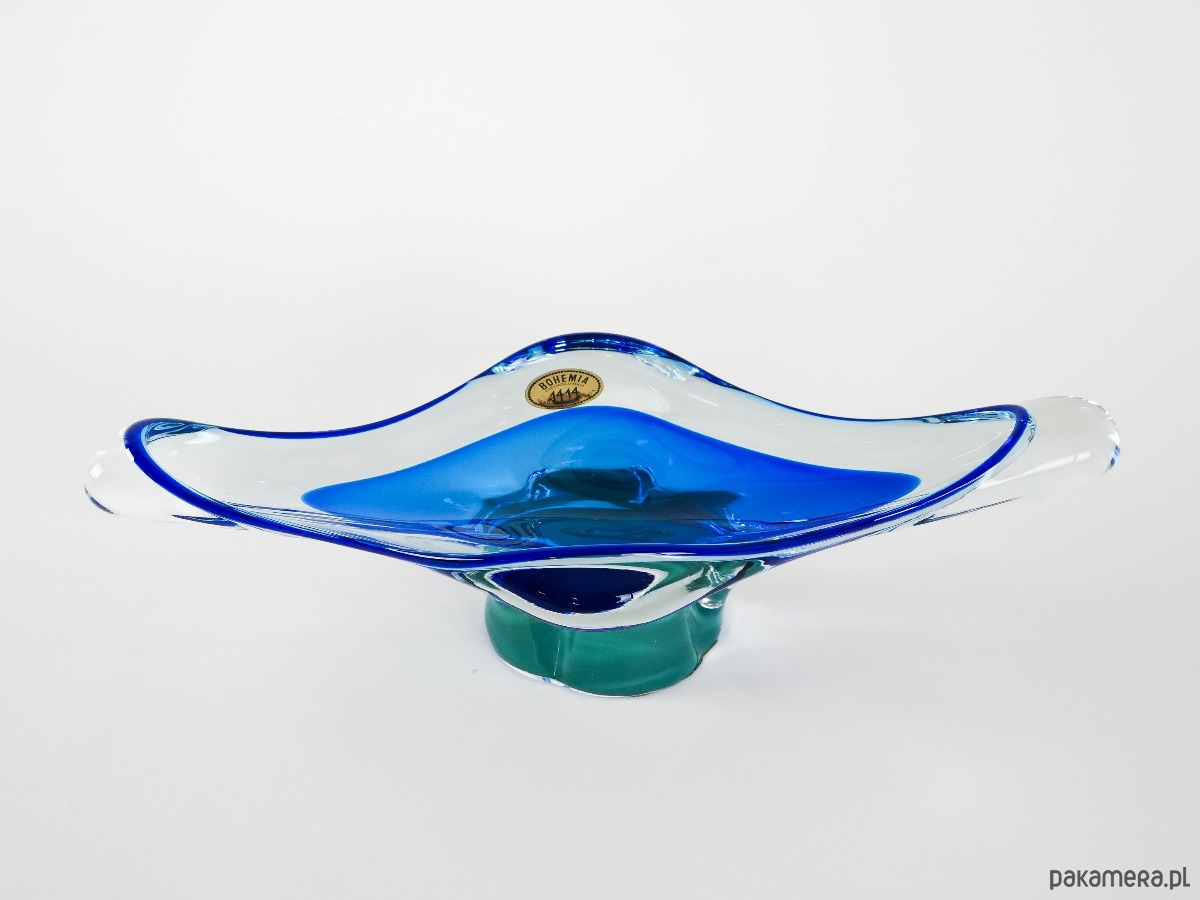 Zjawiskowa patera z czeskiego szkła kryształowego Bohemia, o rzeźbiarskiej, rozciągniętej formie i płynnej linii, która zachwyca dynamiką i lekkością. Wewnątrz przenikają się odcienie błękitu i zieleni, tworząc efekt głębi typowy dla najlepszych hut szkła z regionu Karlovy Vary. Każdy egzemplarz powstawał ręcznie, co sprawia, że to unikatowe dzieło rzemiosła artystycznego. Doskonała jako centralna dekoracja stołu, misa na owoce, lub kolekcjonerski obiekt vintage. Ikona czeskiego designu lat 70. – elegancka, ponadczasowa i mistrzowsko wykonana.
