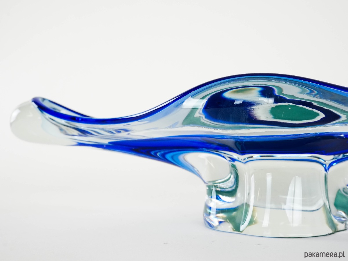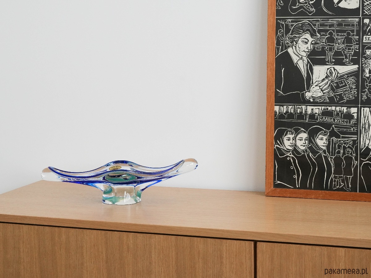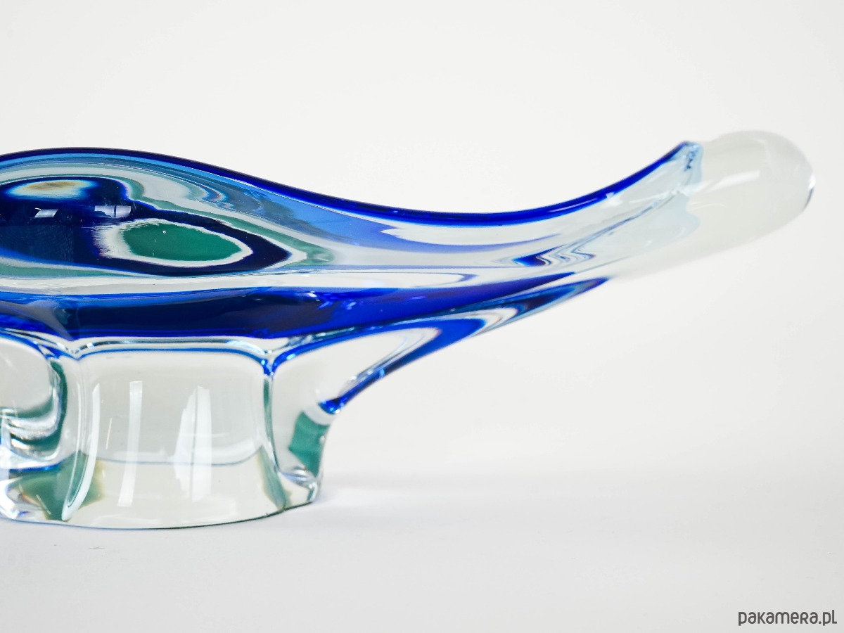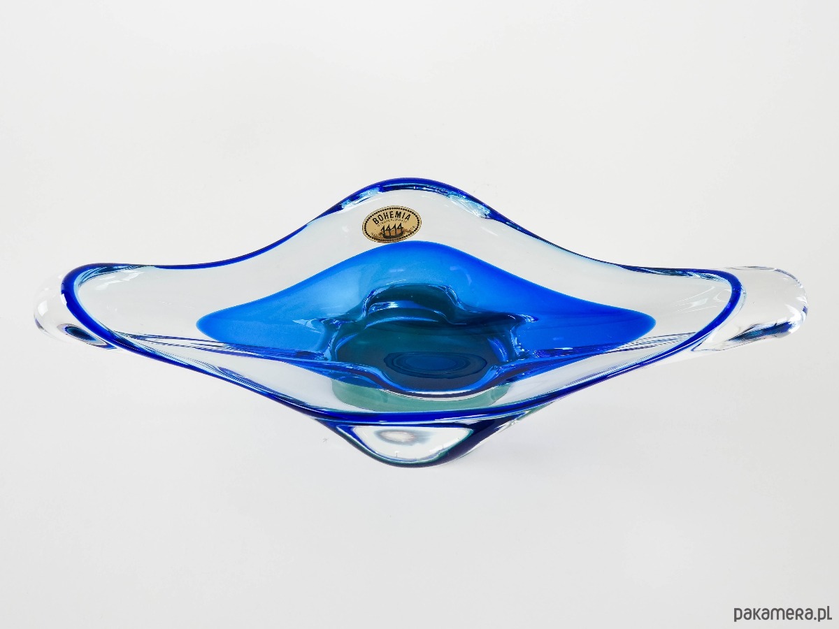 Zjawiskowa patera z czeskiego szkła kryształowego Bohemia, o rzeźbiarskiej, rozciągniętej formie i płynnej linii, która zachwyca dynamiką i lekkością. Wewnątrz przenikają się odcienie błękitu i zieleni, tworząc efekt głębi typowy dla najlepszych hut szkła z regionu Karlovy Vary. Każdy egzemplarz powstawał ręcznie, co sprawia, że to unikatowe dzieło rzemiosła artystycznego. Doskonała jako centralna dekoracja stołu, misa na owoce, lub kolekcjonerski obiekt vintage. Ikona czeskiego designu lat 70. – elegancka, ponadczasowa i mistrzowsko wykonana.