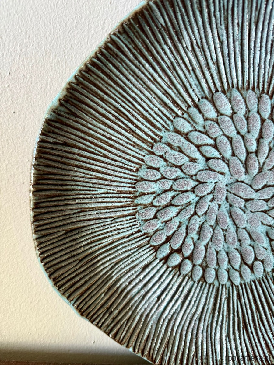 Ta ręcznie robiona patera z kolekcji Deep Lines to wyjątkowy element dekoracyjny, który łączy w sobie naturalne piękno gliny i artystyczne wykończenie. Została wykonana z czerwonej gliny, a jej wnętrze zdobią dekoracyjne rzeźbienia, podkreślone błyszczącym szkliwem w odcieniach niebieskiego z czarnymi przebarwieniami.