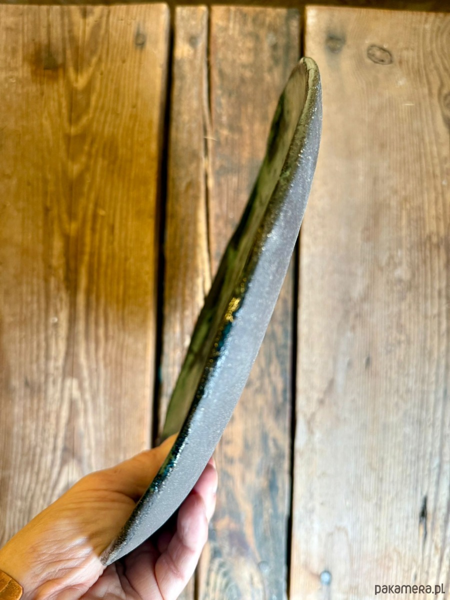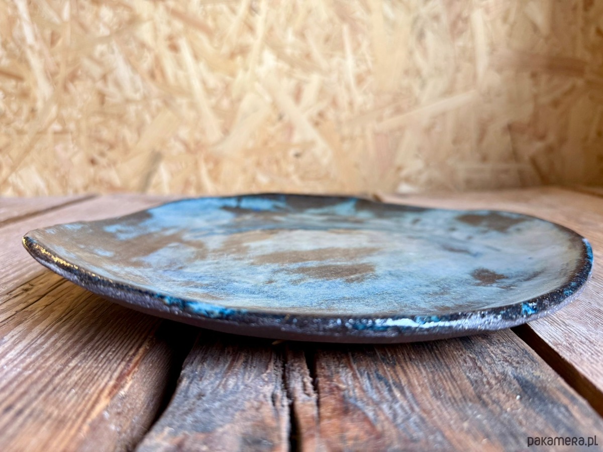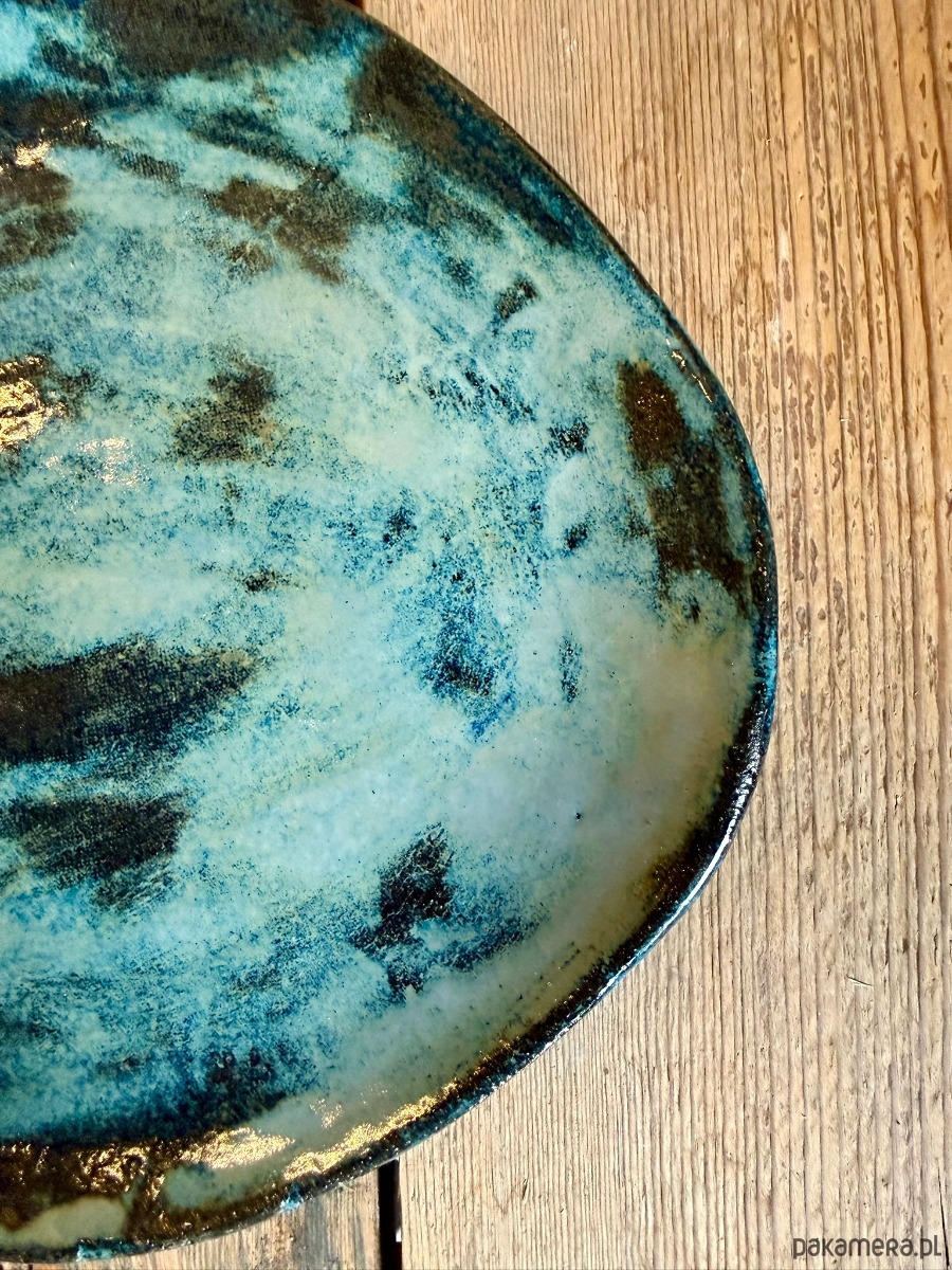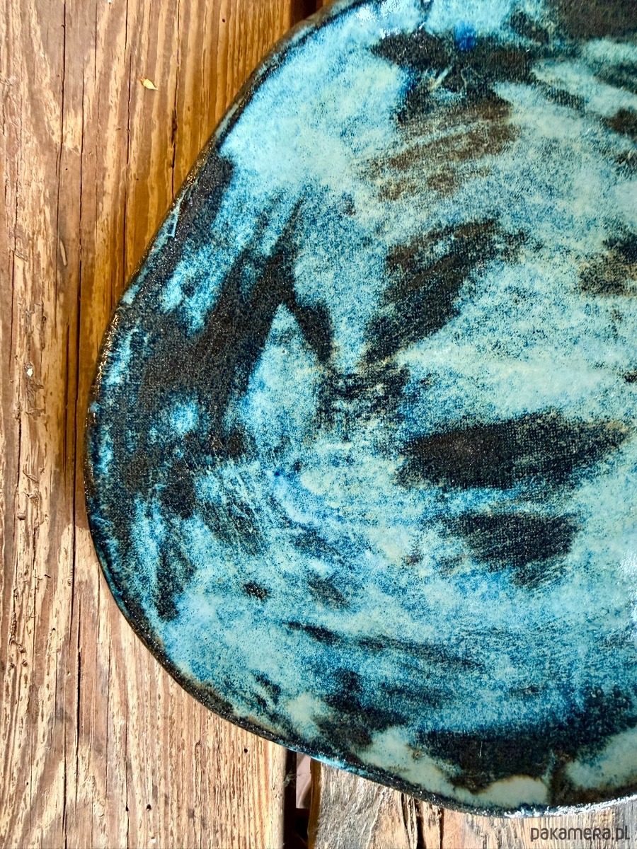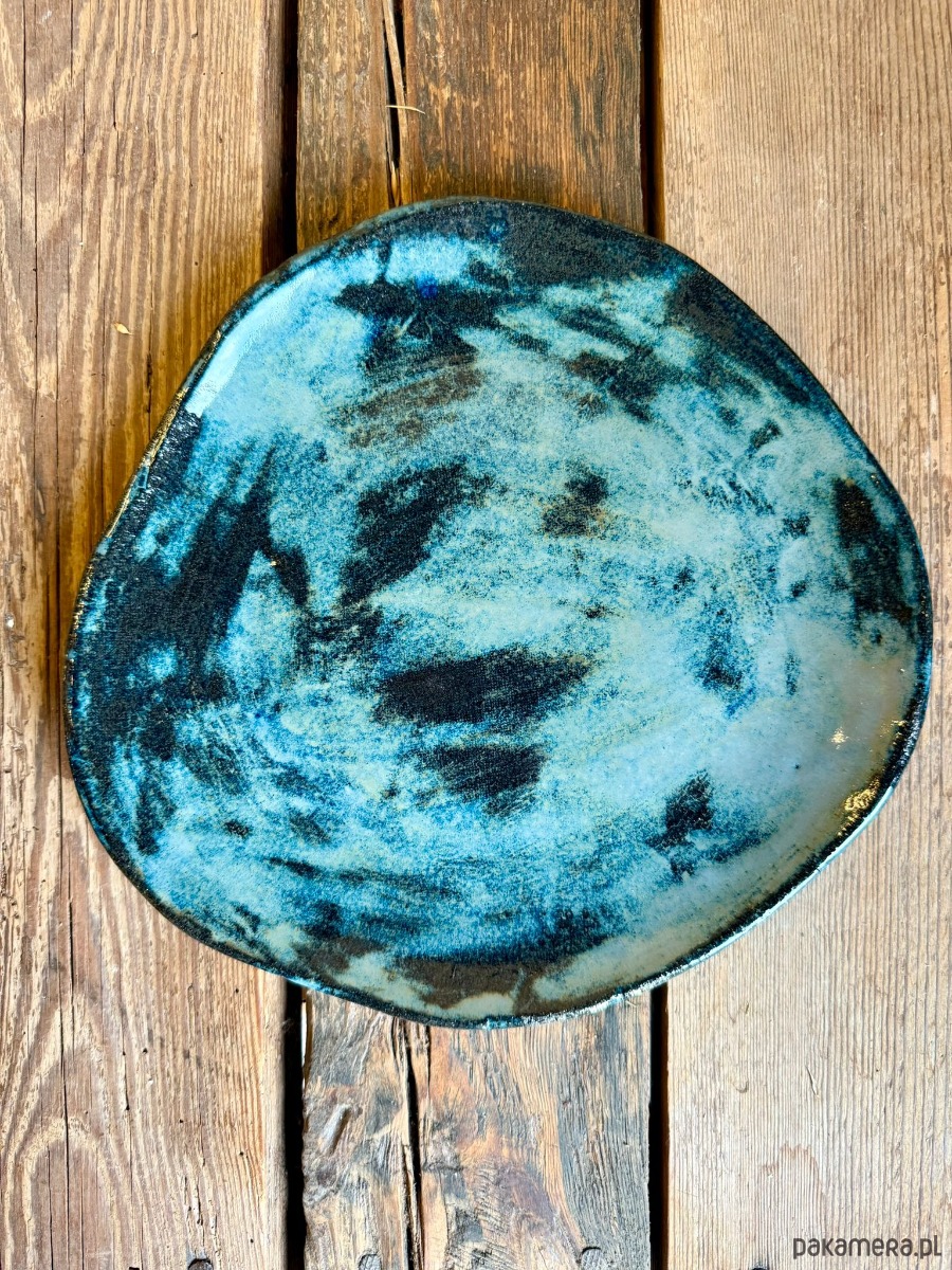 Ręcznie wykonana patera ceramiczna handmade z czarnej gliny, wykończona błyszczącym szkliwem efektowym w odcieniach granatu i brązów. Średnica 27 cm. Połączenie ciemnej, głębokiej bazy czarnej gliny z intensywnym szkliwem daje wyrazisty, a jednocześnie szlachetny efekt. Szkliwo dopuszczone do kontaktu z żywnością oraz możliwość mycia w zmywarce sprawiają, że patera łączy funkcję dekoracyjną z codzienną użytecznością.