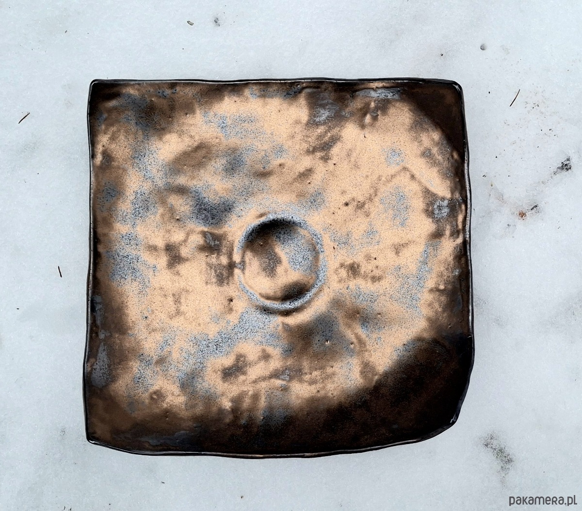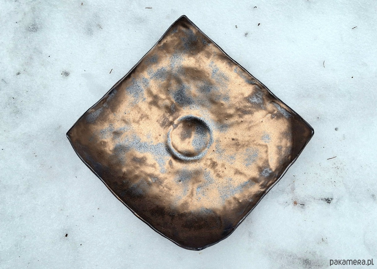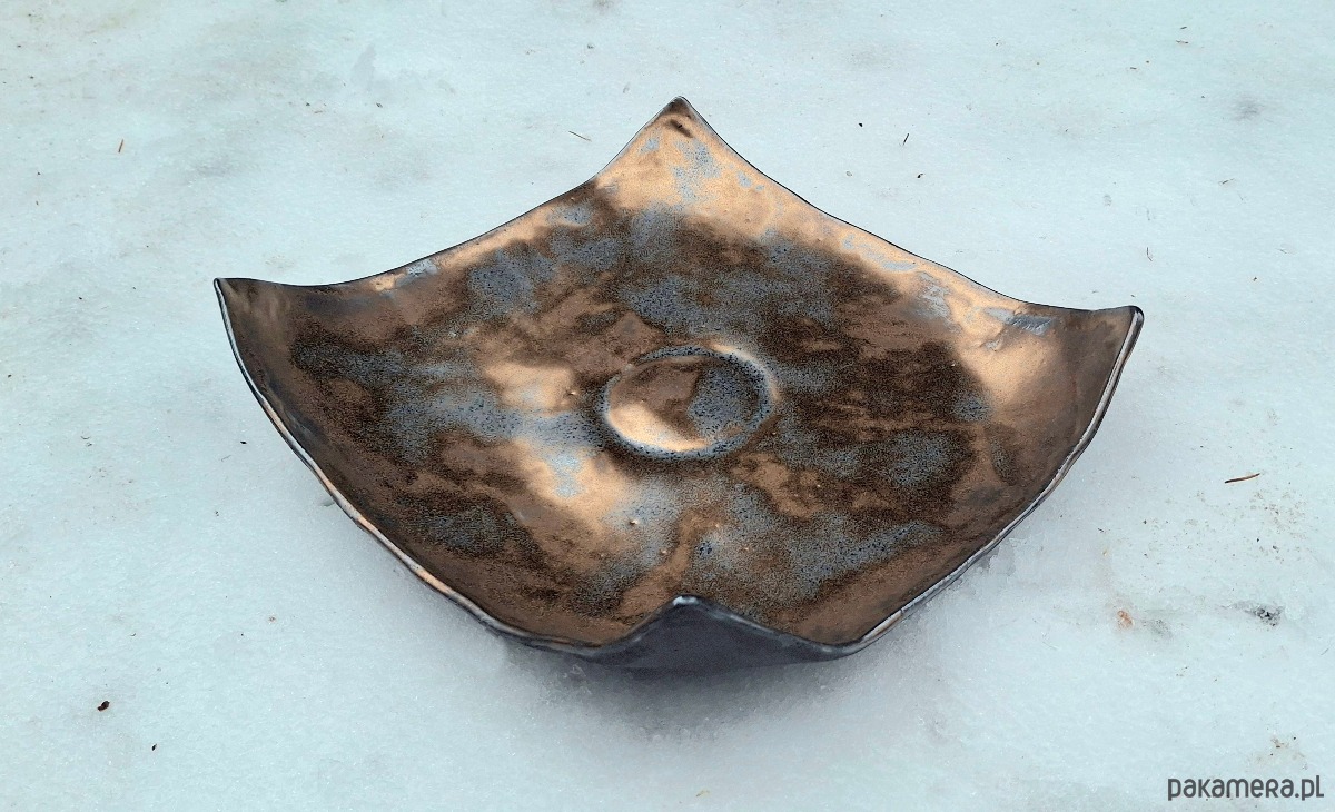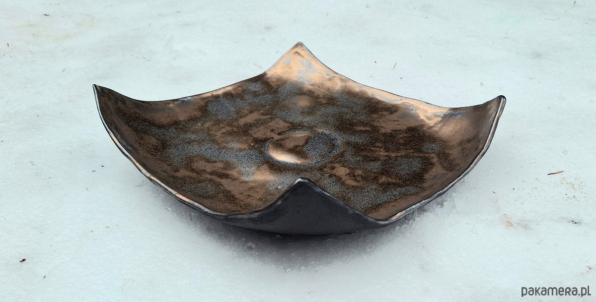 Ta patera to wyjątkowy przykład współczesnej ceramiki artystycznej, która łączy surowość formy z ciepłem metalicznego wykończenia. Jej geometryczna baza, oparta na planie kwadratu, została przełamana mocno uniesionymi rogami, co nadaje jej dynamiczny, niemal organiczny charakter. Wnętrze naczynia to prawdziwy spektakl tekstur – przypomina ono powierzchnię nieznanej planety lub zastygłą, metaliczną magmę. Miedziane i złote tony nie są tu gładkie ani oczywiste; przenikają się z grafitowym zmatowieniem, co nadaje przedmiotowi szlachetnej patyny. To obiekt, który z każdej strony wygląda inaczej, bawiąc się światłem i cieniem. To naczynie wykracza poza funkcję czysto użytkową, stając się obiektem dekoracyjnym o silnym wyrazie.