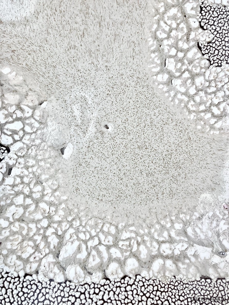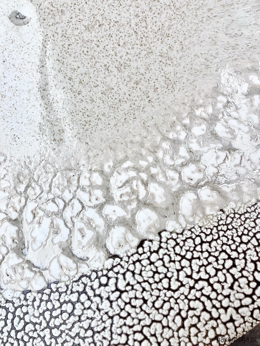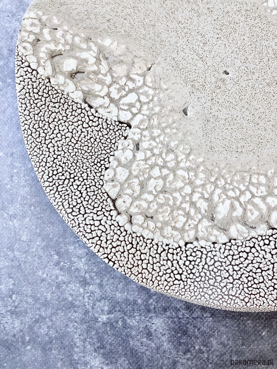 Patera DEEP INTO THE SEA to ceramiczne dzieło, w którym tekstury i barwy przywodzą na myśl organiczne struktury dna oceanu. Jej powierzchnia przenika się płynnie między delikatnym, piaskowym matem a głębokimi, spękanymi partiami przypominającymi koralowce i morskie skały.