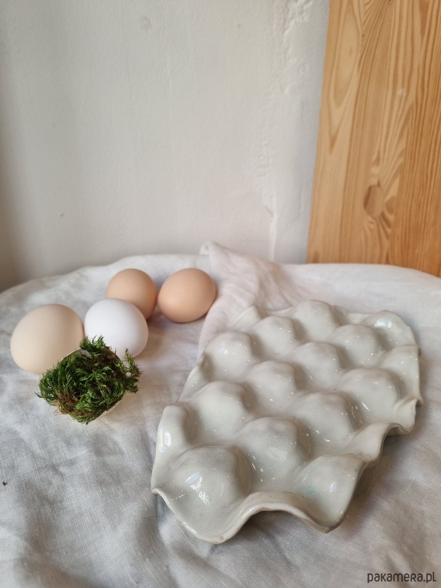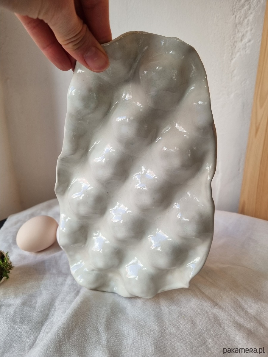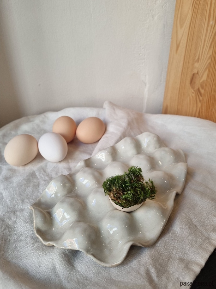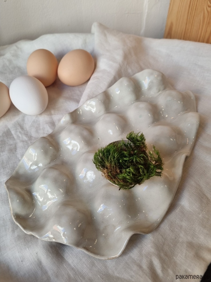 Wyjątkowa, ręcznie wykonaną paterę do serwowania jajek, idealną na wielkanocny stół. Każdy egzemplarz jest unikalny, lepiony i malowany ręcznie. Naczynie pokryte jest bezbarwnym szkliwem, które jest bezpieczne do kontaktu z żywnością, co gwarantuje jego funkcjonalność i estetykę.