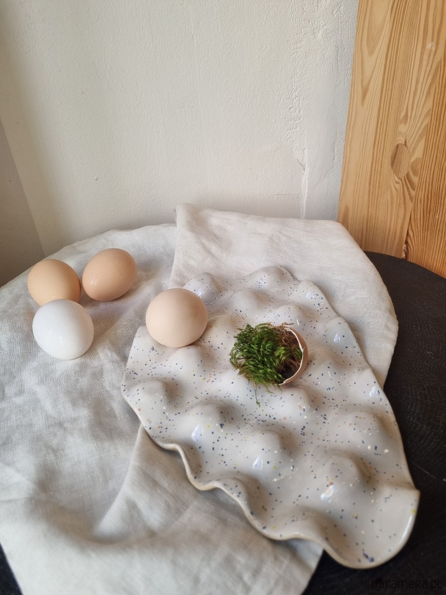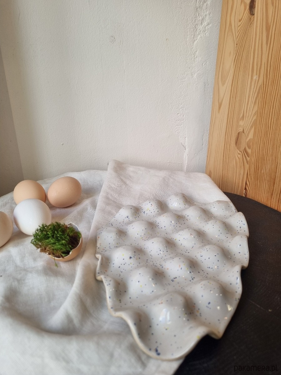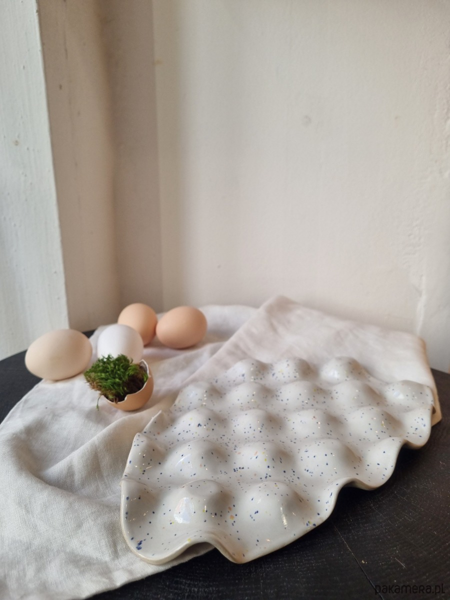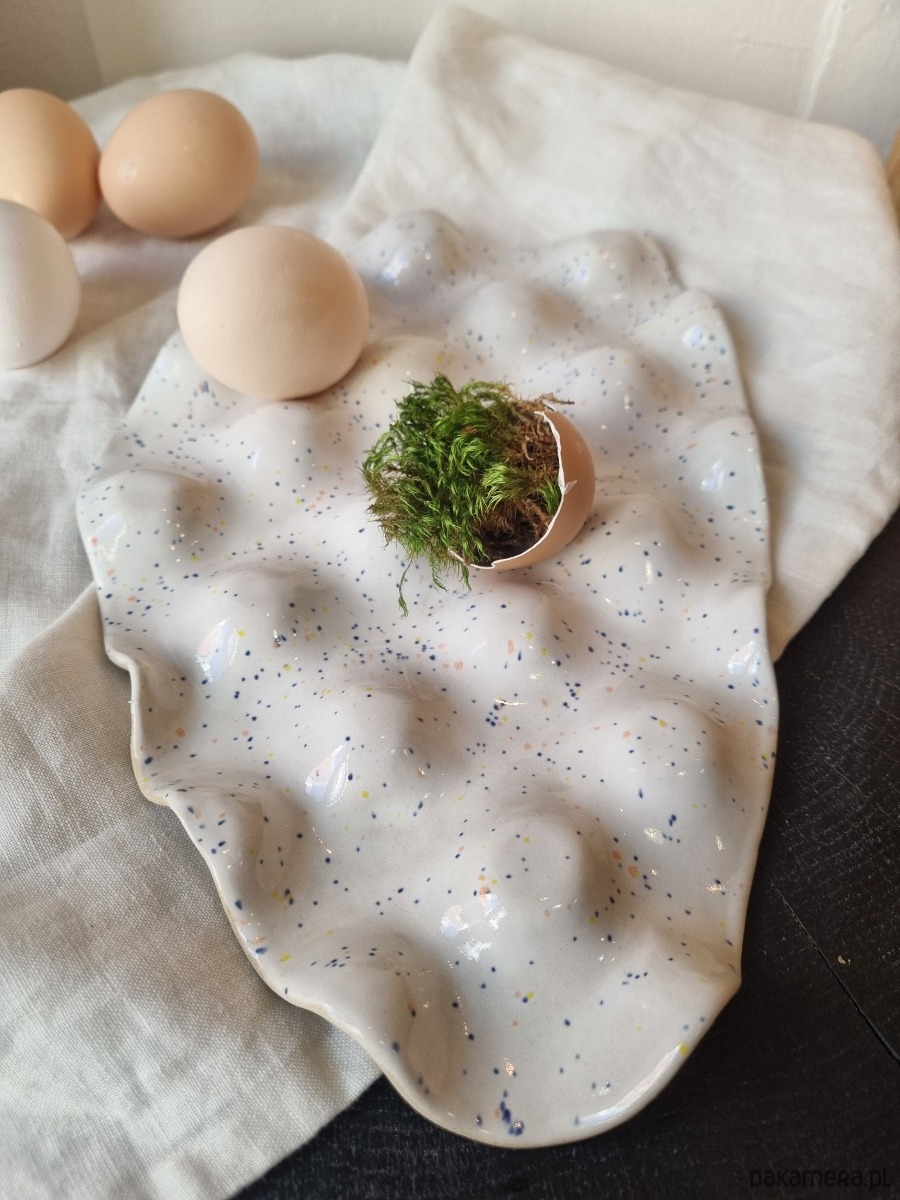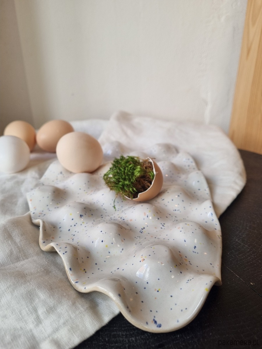 Wyjątkowa, ręcznie wykonaną paterę do serwowania jajek, idealną na wielkanocny stół. Każdy egzemplarz jest unikalny, lepiony i malowany ręcznie. Naczynie pokryte jest bezbarwnym szkliwem, które jest bezpieczne do kontaktu z żywnością, co gwarantuje jego funkcjonalność i estetykę.