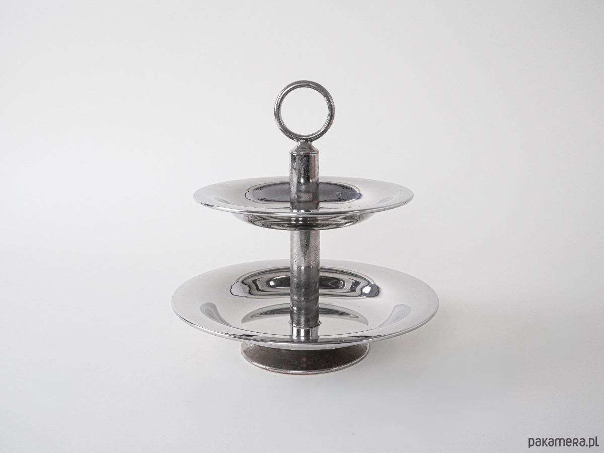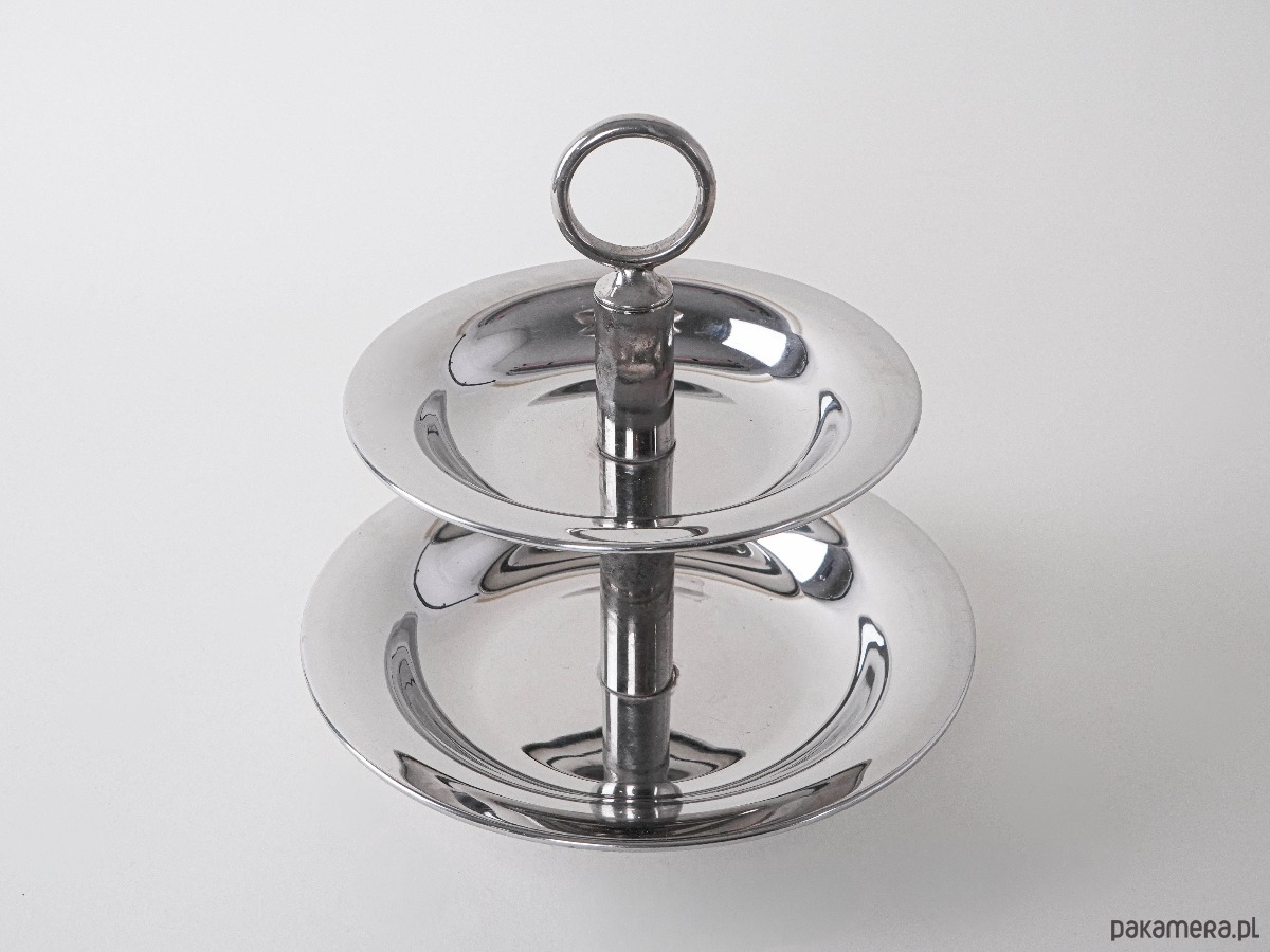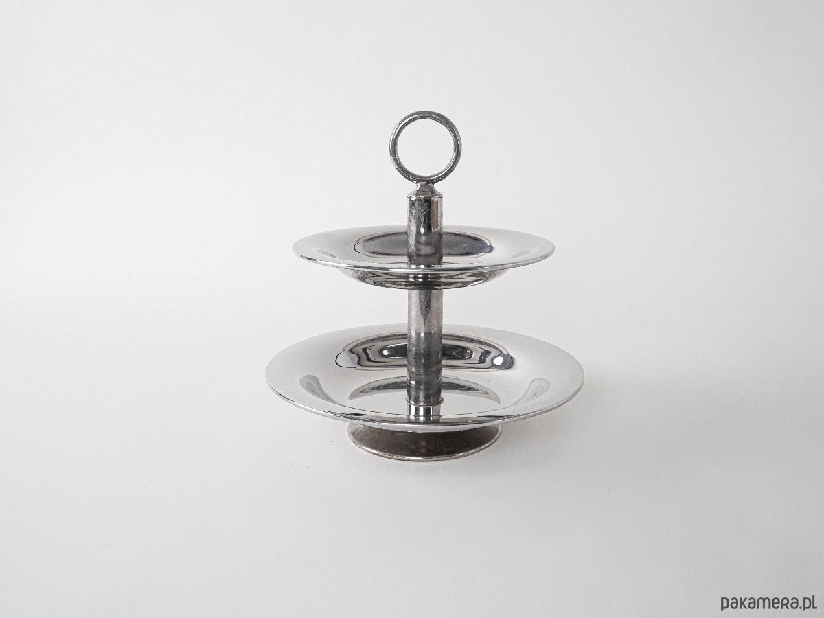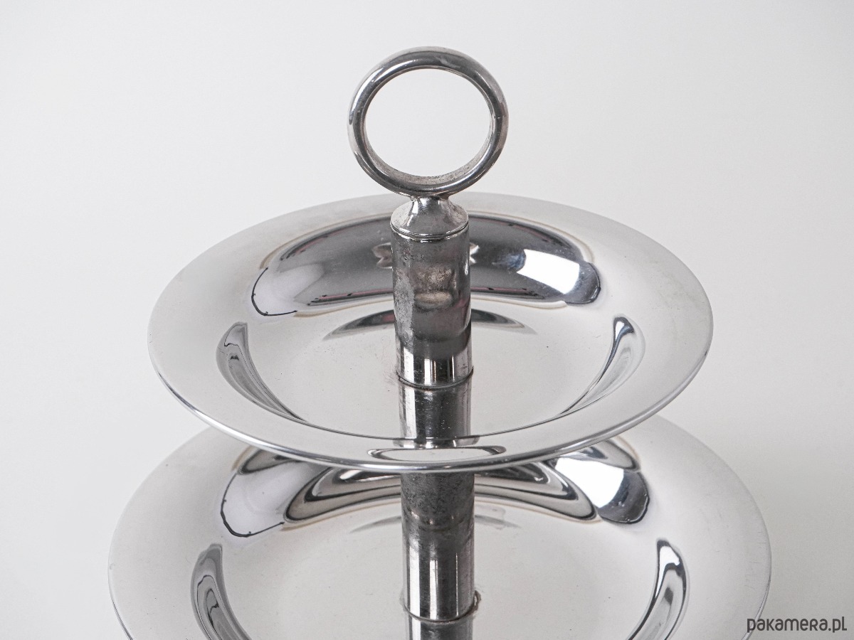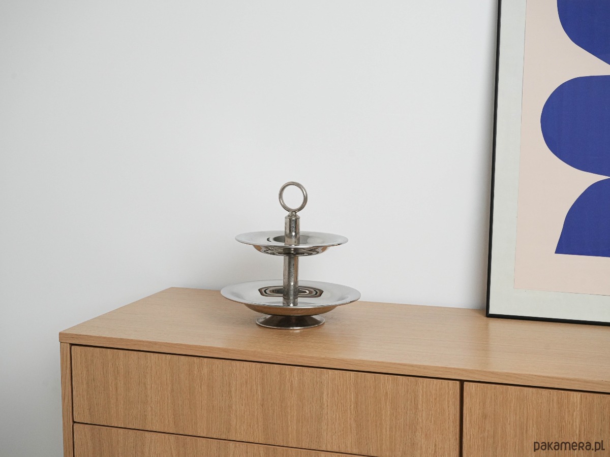 Dwupoziomowa patera w stylu vintage, wykonana z polerowanej stali nierdzewnej. Minimalistyczna forma z geometrycznym uchwytem w kształcie pierścienia wpisuje się w estetykę Mid Century Modern. Prosty, a zarazem elegancki design sprawia, że patera doskonale sprawdzi się do serwowania owoców, ciast czy przekąsek, a jednocześnie będzie stylową ozdobą stołu.