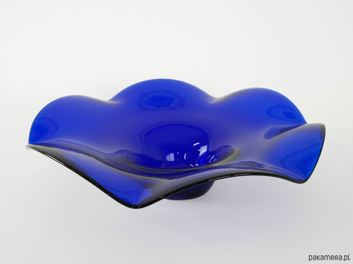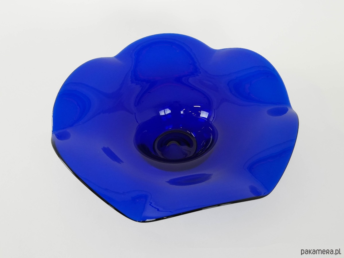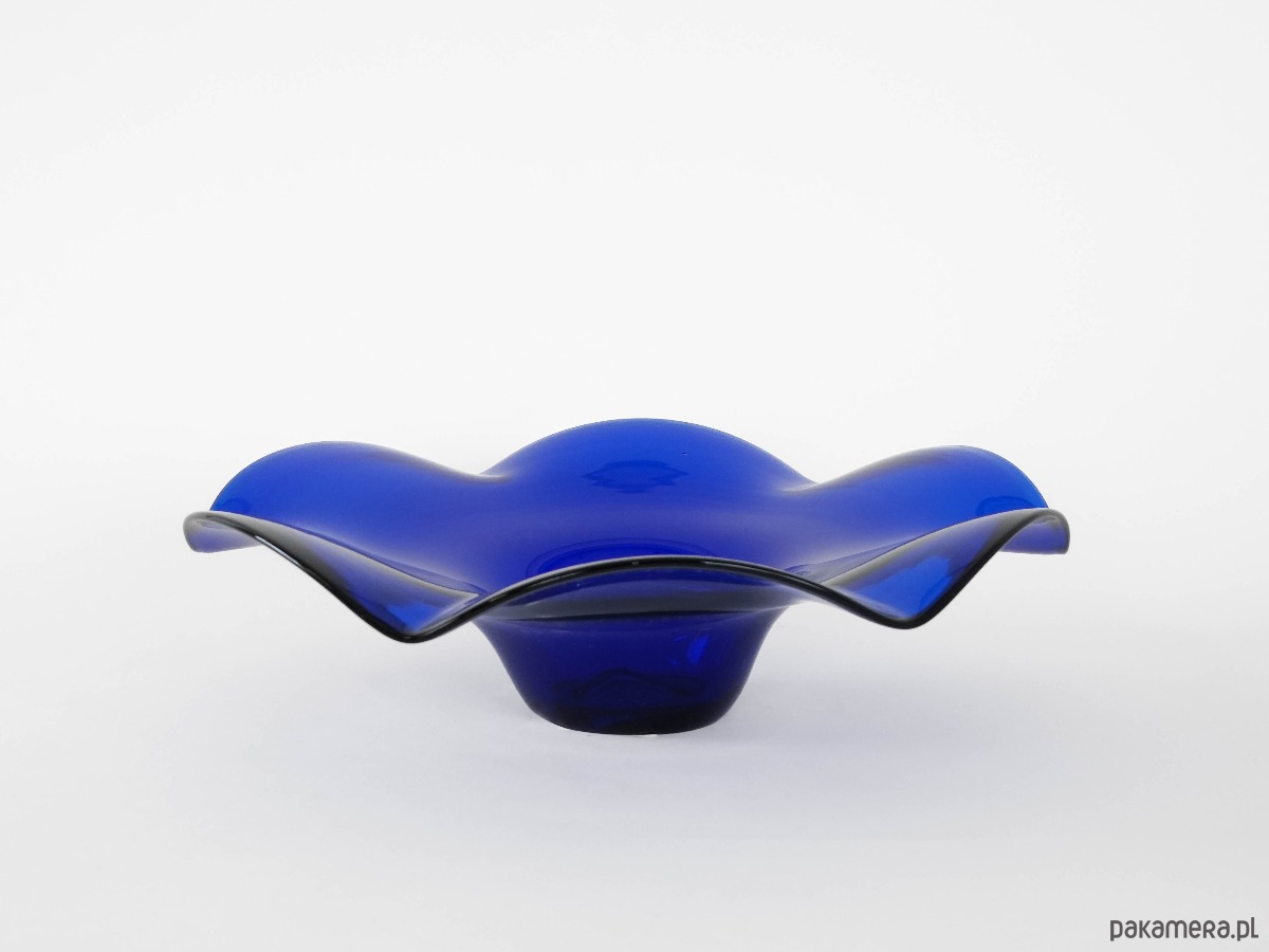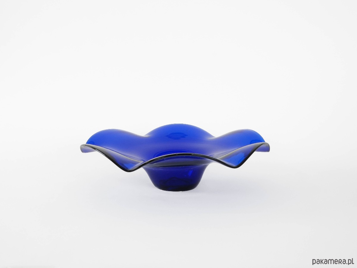 Kobaltowa patera z falbaną ze szkła, wyprodukowana w latach 70-tych. Produkcja duńska.
