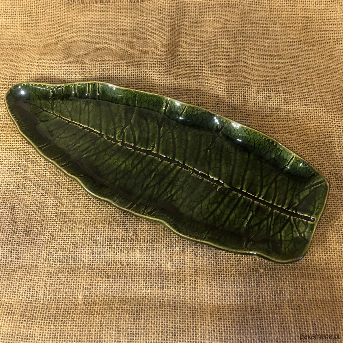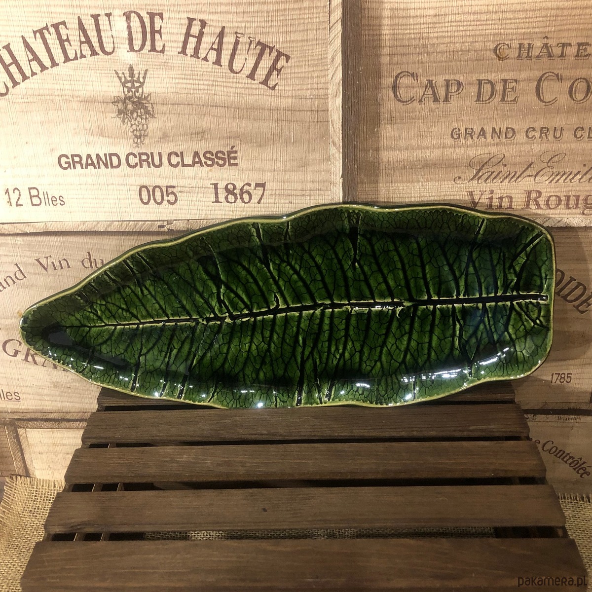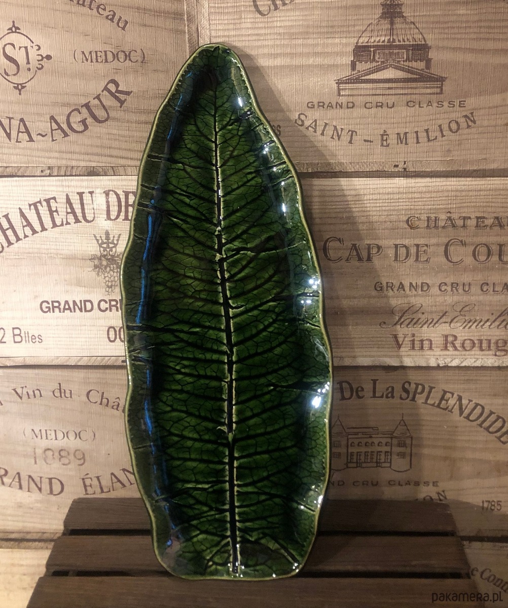 Duża patera w kolorze butelkowej zieleni z odbitym naturalnym liściem chrzanu.
