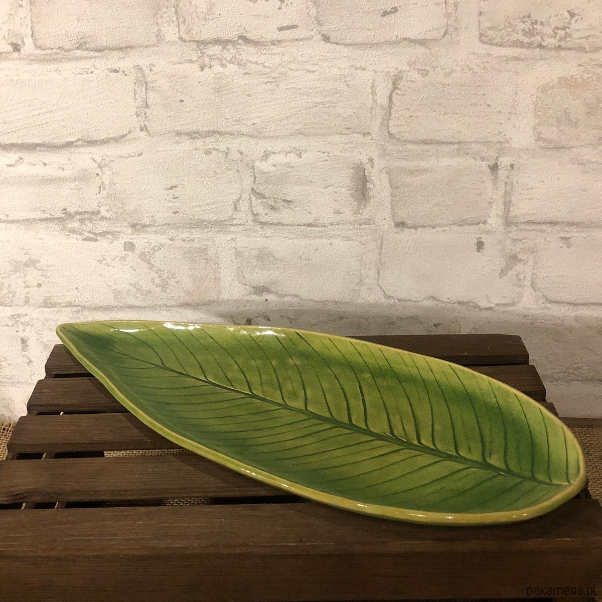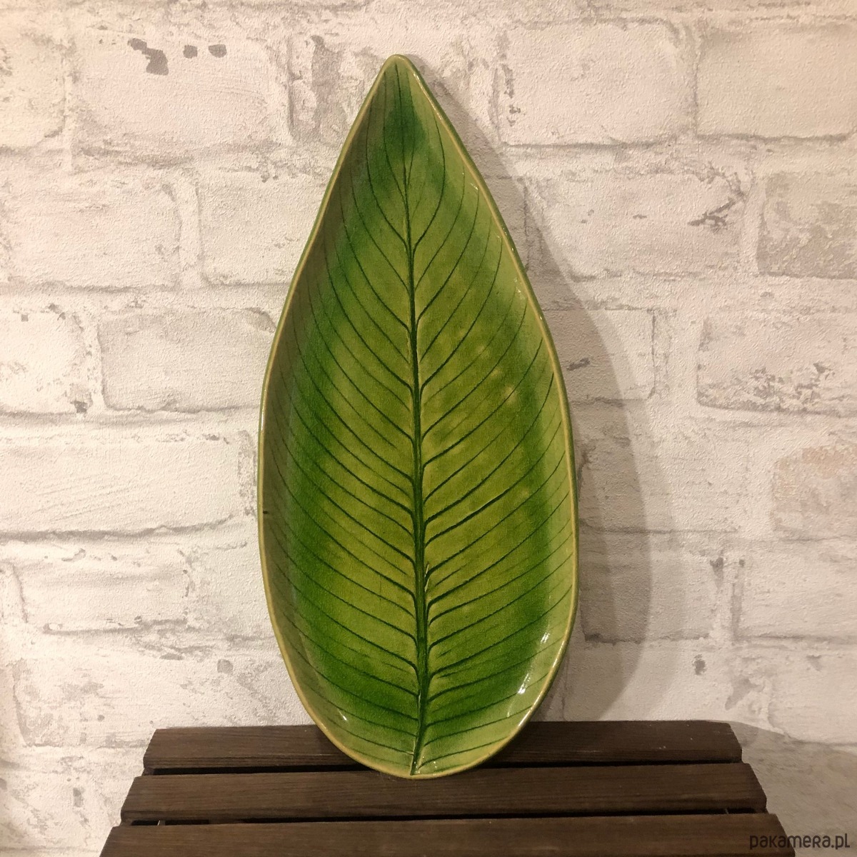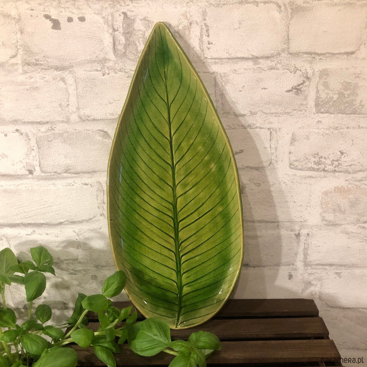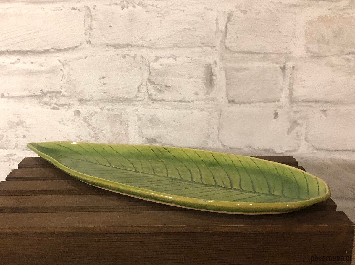 Patera ceramiczna w kolorze soczystej zieleni z odciśniętym wzorem naturalnego liścia skrzydłokwiatu.