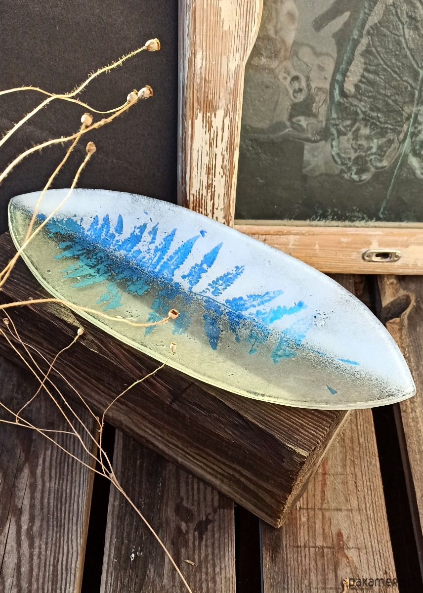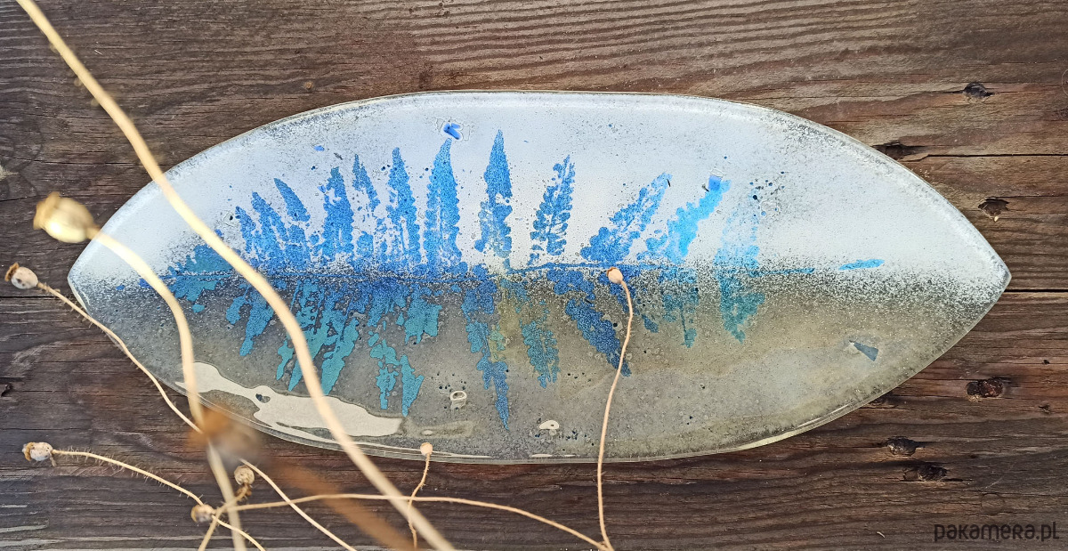 Szklana patera w kształcie łódki, ozdobiona roślinnym motywem paproci. Wykonana ręcznie w technice fusingu, kolor i wzór zostały trwale zgrzane pomiędzy dwoma taflami szkła w temperaturze powyżej 800 stopni. Brzegi naczynia delikatnie wygięte do góry. Wymiary ok.15,5x39cm,wys.ok.2cm.Egzemparz unikatowy.