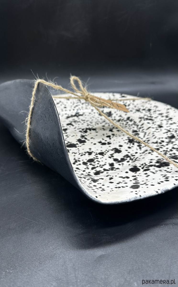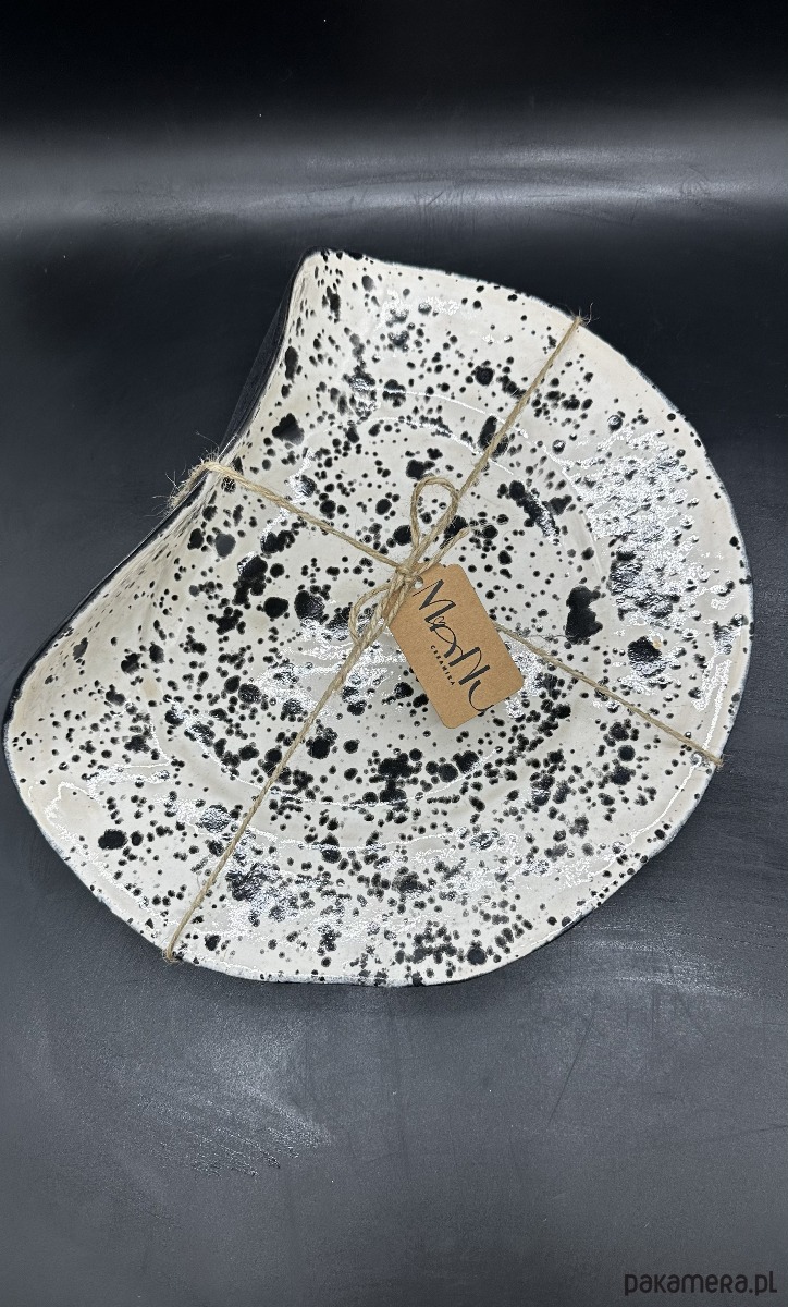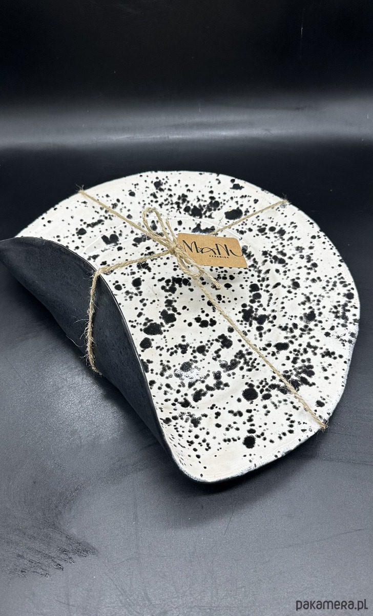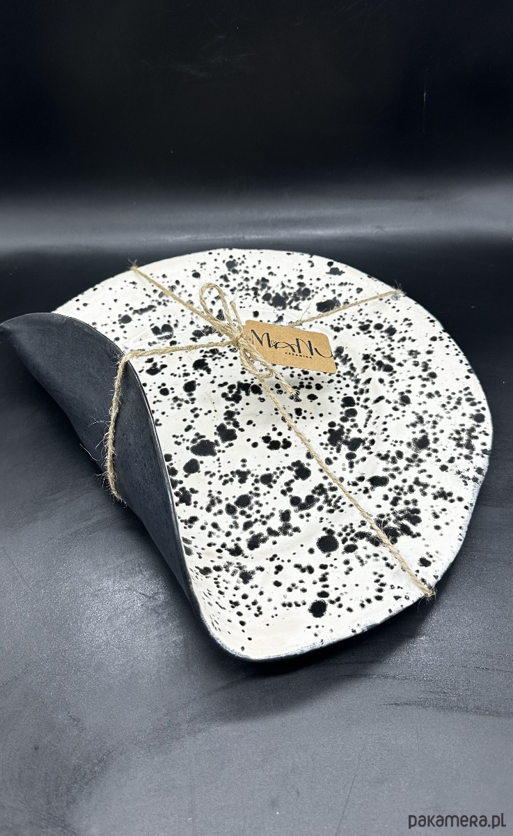 Oryginalna i wyjątkowa Patera „Manu Moon Dalmatin” – o średnicy 34 cm, design w każdym calu. Granitowy spód, księżycowy kształt. Patera ręcznie malowana, zdobiona czarnymi plamkami, niczym kropki dalmatyńczyka.