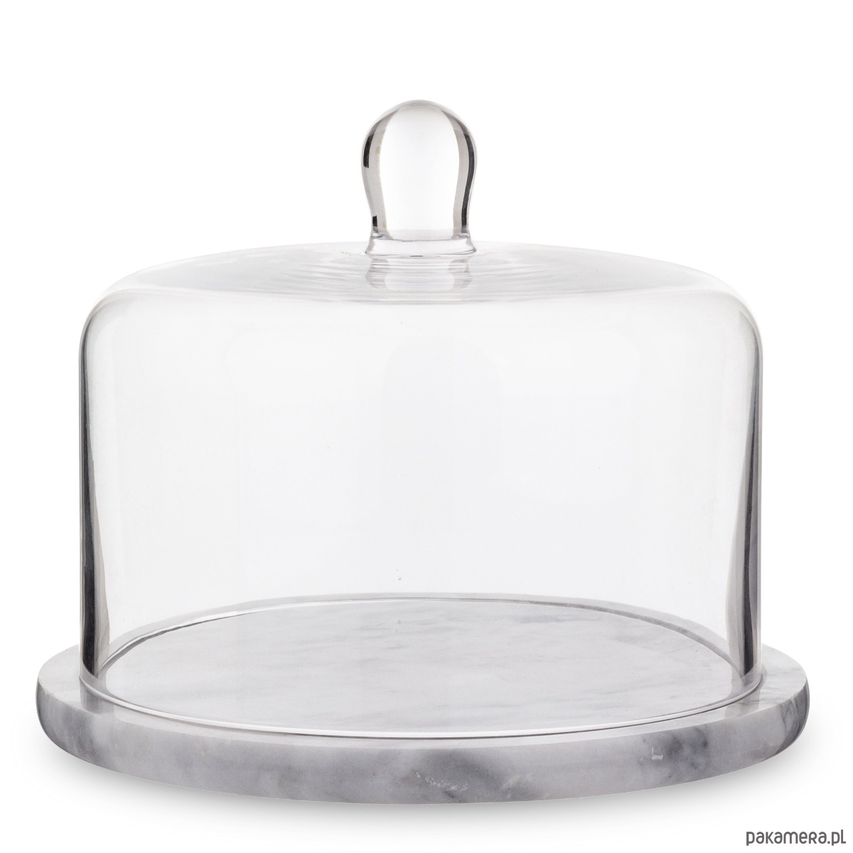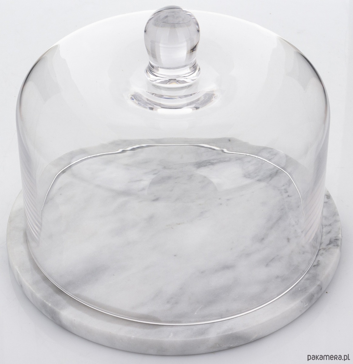 Elegancka patera na ciasto. Podstawa wykonana z naturalnego marmuru. Pokrywę wykonano z transparentnego szkła.